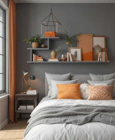 Install grey floating shelves and style them with orange books, plants, or décor. This setup adds functional storage while enhancing visual interest. It helps keep the room organized and stylish Grey and Orange Bedroom.
