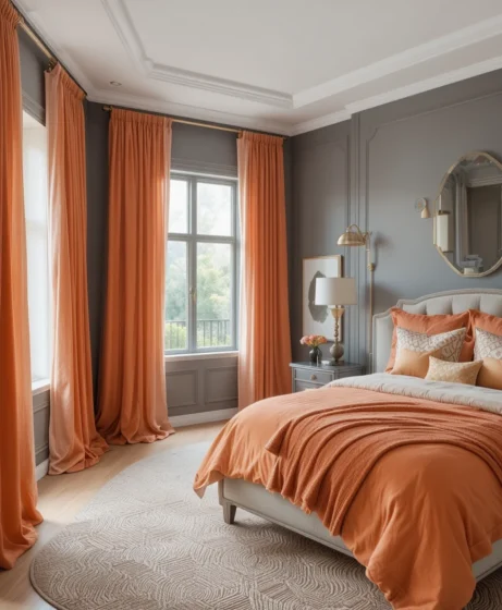 Combine sleek grey walls with curtains that fade from soft peach to deep orange for a stunning ombre effect. This look adds drama and movement without overwhelming the room. The gradient creates a warm and inviting atmosphere Grey and Orange Bedroom.