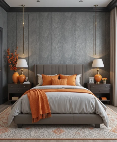 Add depth by installing textured grey wallpaper and layering orange accents like vases or cushions. The texture creates dimension while the orange provides a lively contrast. This idea works well in both large and small bedrooms.