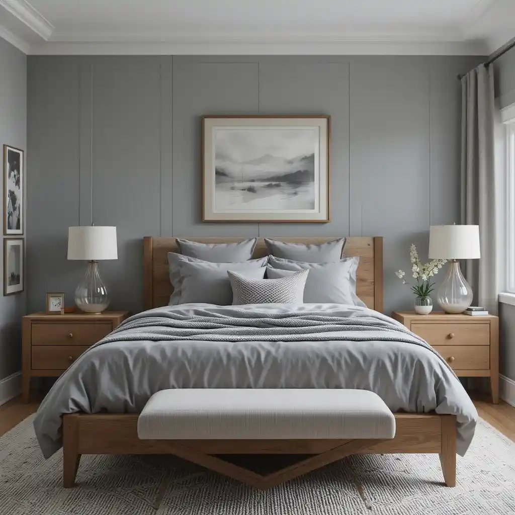 Blend grey textiles or walls with oak or walnut furniture for a warm-meets-cool contrast that feels earthy and grounded. Grey Bedroom Ideas