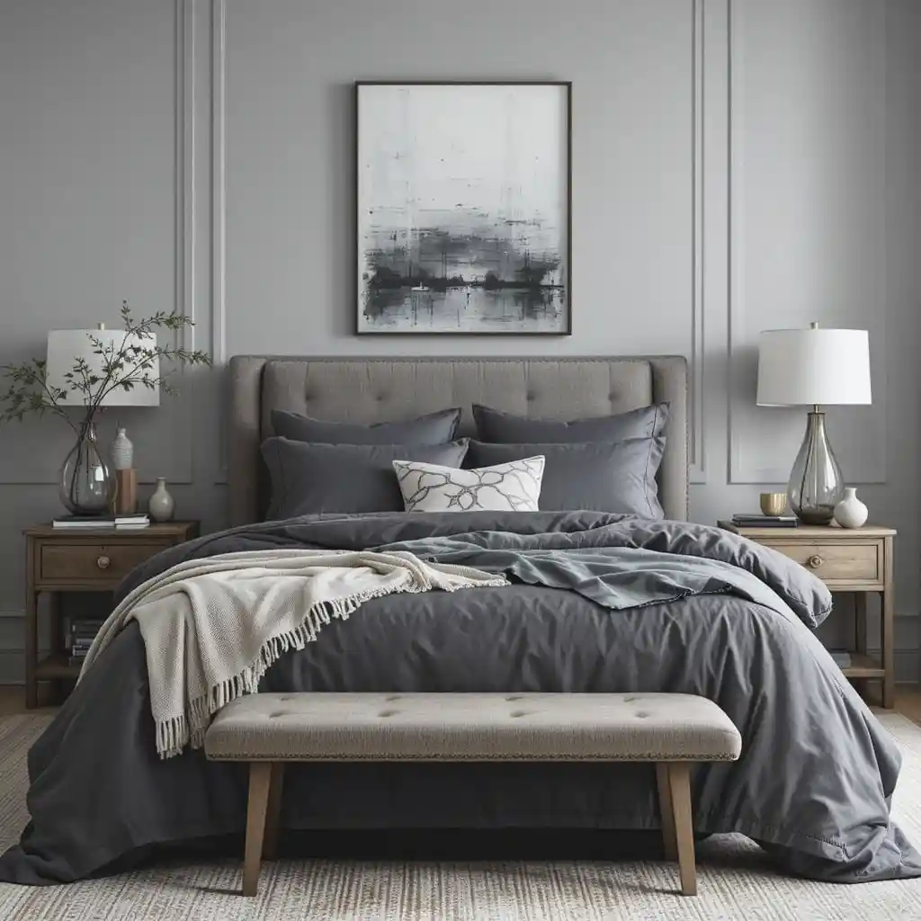 Dark grey bedding sets stand out beautifully against pale grey or white walls, creating a bold focal point that feels inviting
