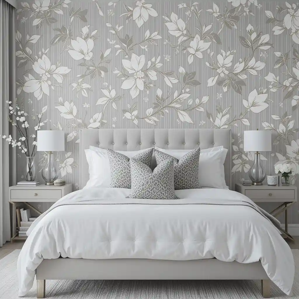 Wallpaper with subtle grey patterns, such as stripes, florals, or geometric designs, adds interest while maintaining a soft look