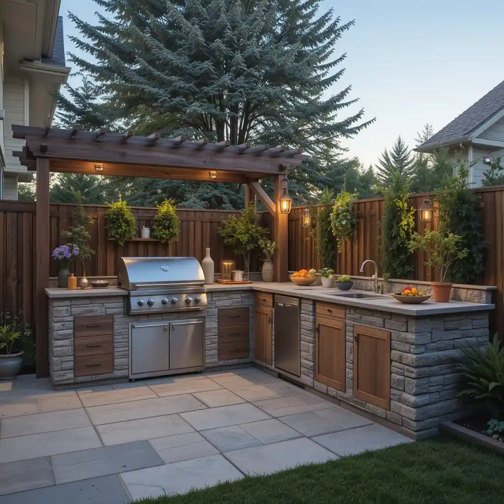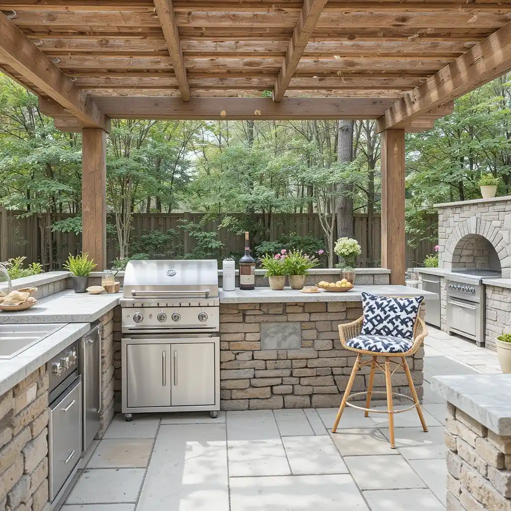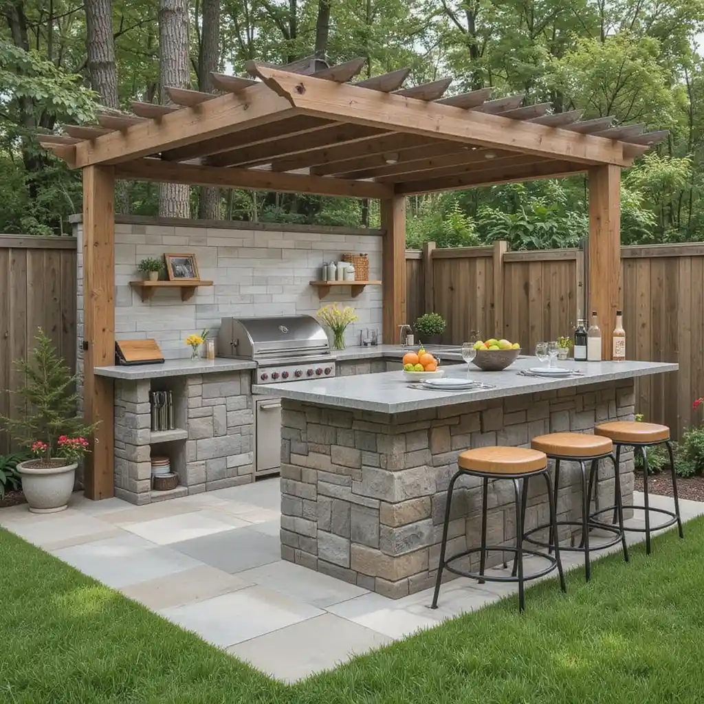 Adding a pergola provides shade and defines the cooking area. Hang string lights or plants from it for ambiance.