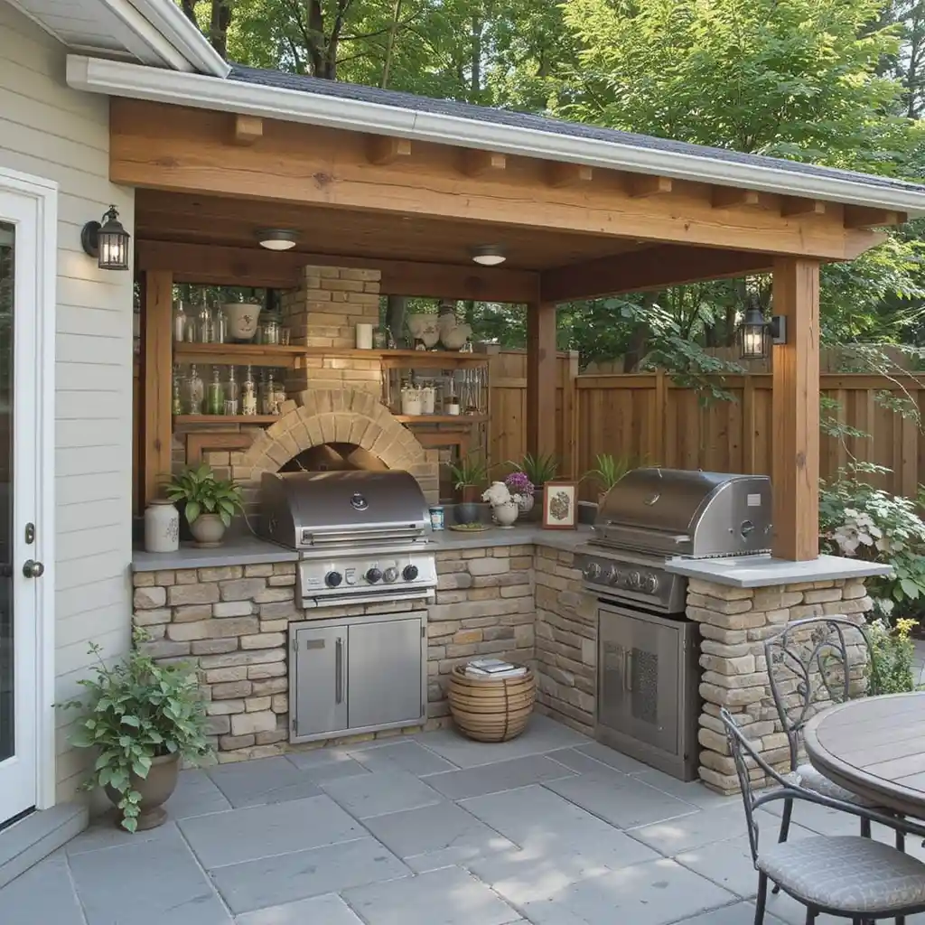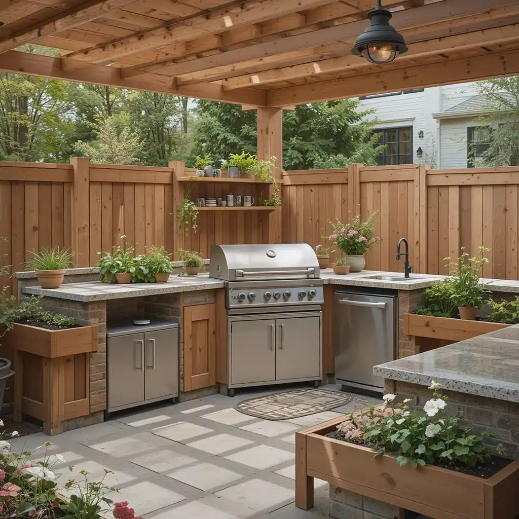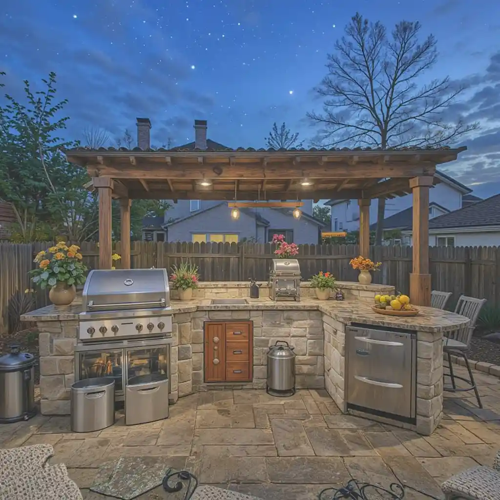 Adding a pergola provides shade and defines the cooking area. Hang string lights or plants from it for ambiance.