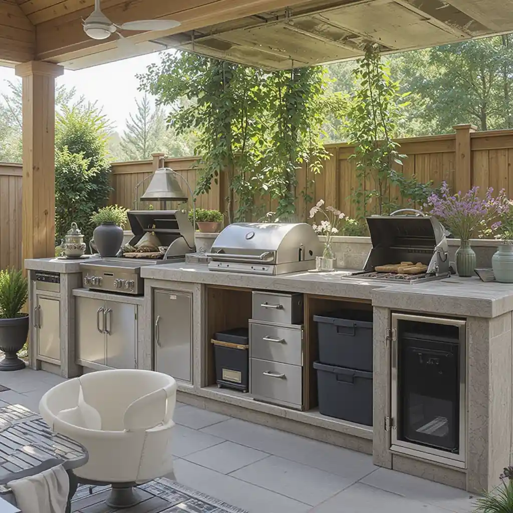Use waterproof bins or weather-resistant cabinets under counters to store charcoal, tools, or tableware securely. Simple Outdoor Kitchen Ideas