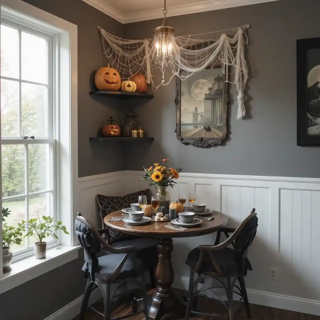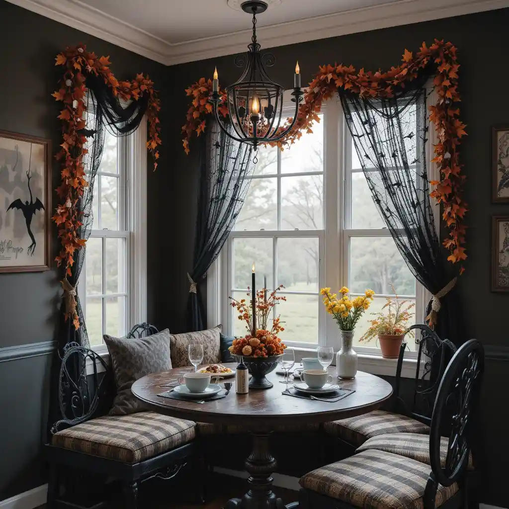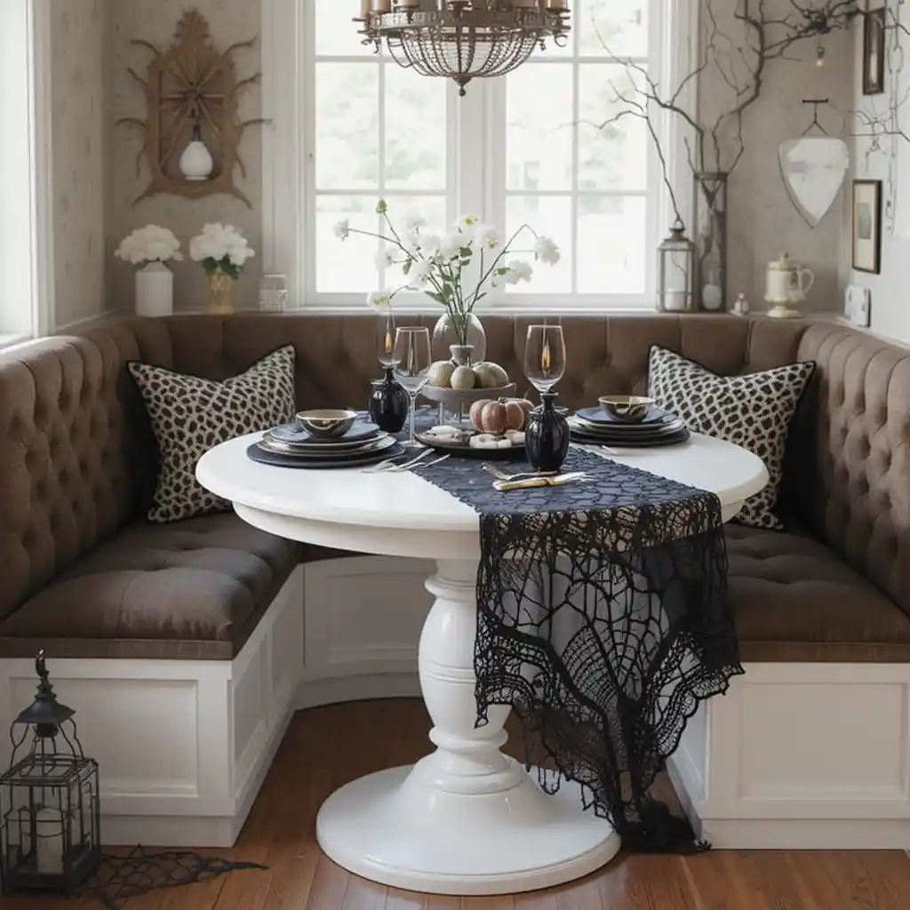Drape a black lace spider web table runner across the center of your nook table. It instantly gives a spooky yet elegant feel without overwhelming the space.