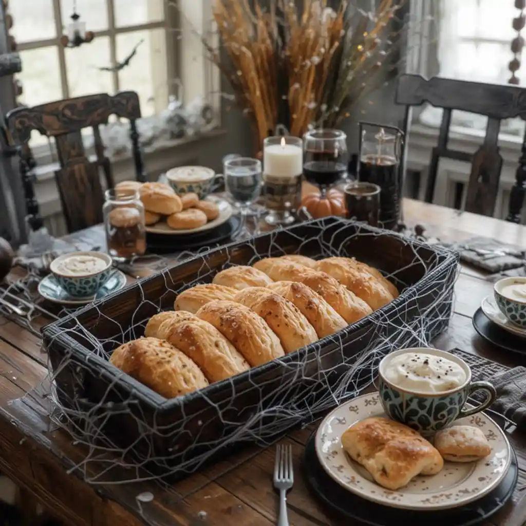 Use a coffin-shaped wooden tray to hold pastries or bread rolls. It’s a subtle nod to Halloween without overpowering the space.