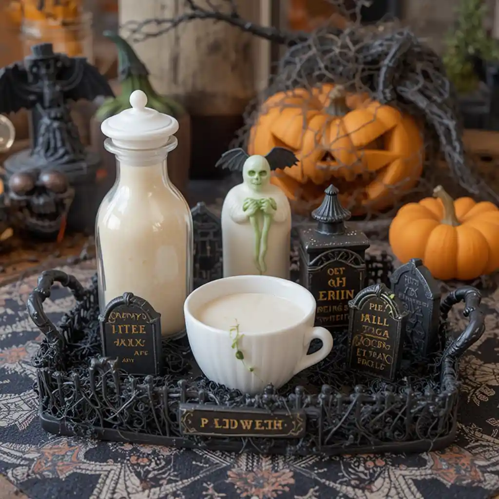 Use a small tray styled like a graveyard to hold sugar, cream, and condiments, complete with tiny tombstones as labels.