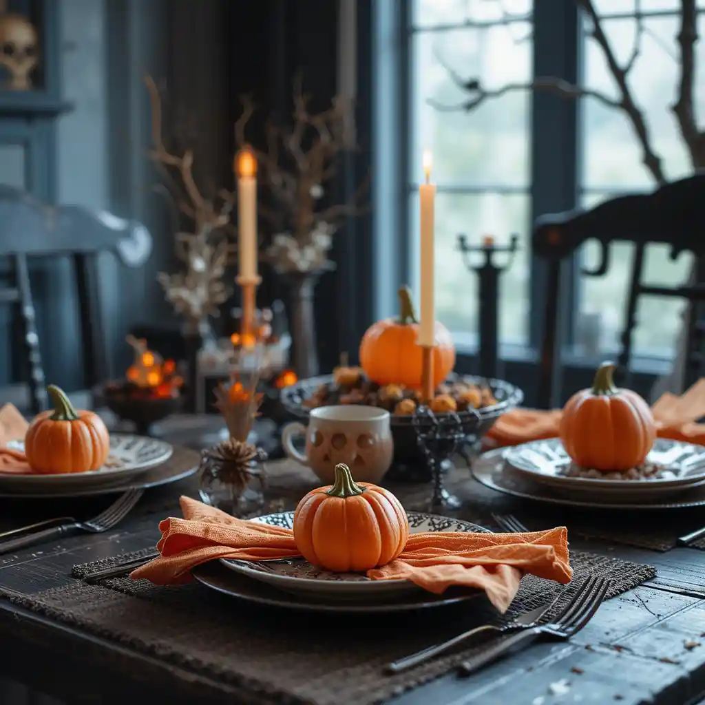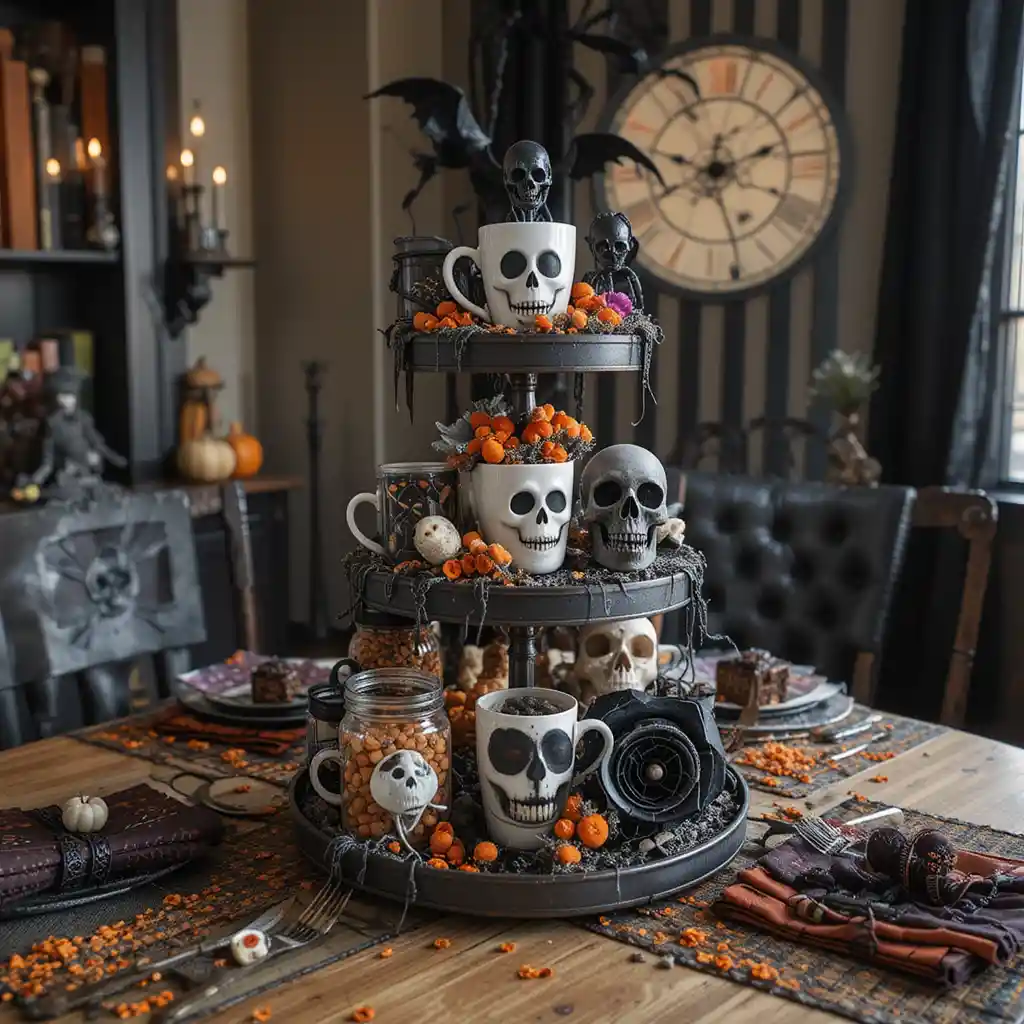 Arrange a tiered tray with Halloween mugs, candy jars, and themed napkins. Place it in the center for easy access during breakfast.