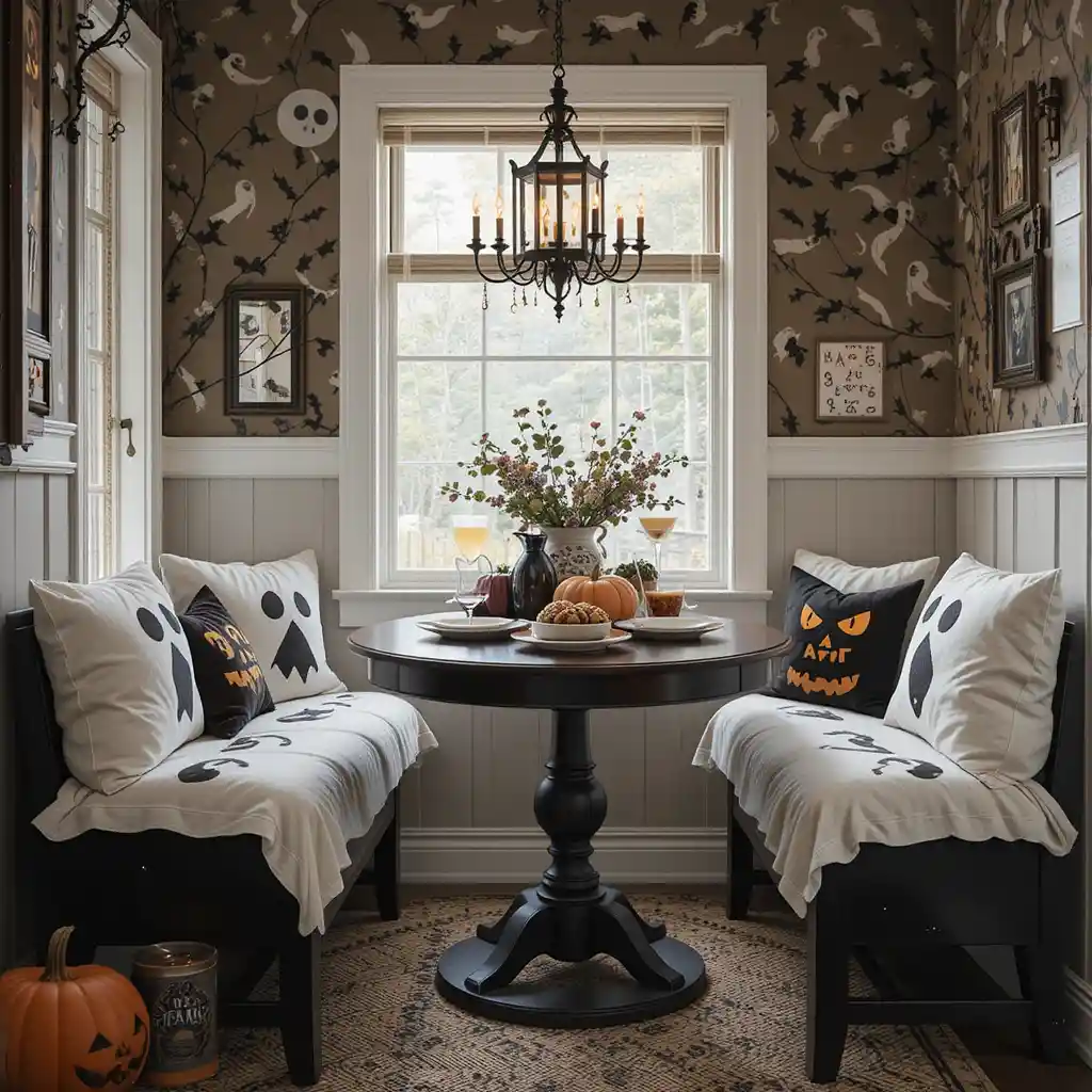 Swap your usual seat cushions for white ghost-themed covers with cute or creepy faces. It’s a quick and playful way to set the tone. Halloween Breakfast Nook Decor Ideas