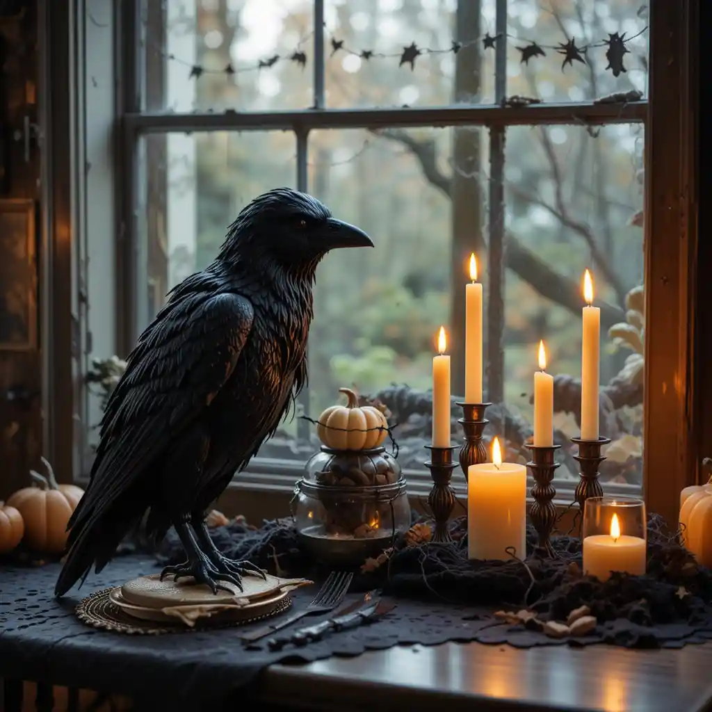 Add a faux black raven perched next to a grouping of LED taper candles for a gothic breakfast nook atmosphere.