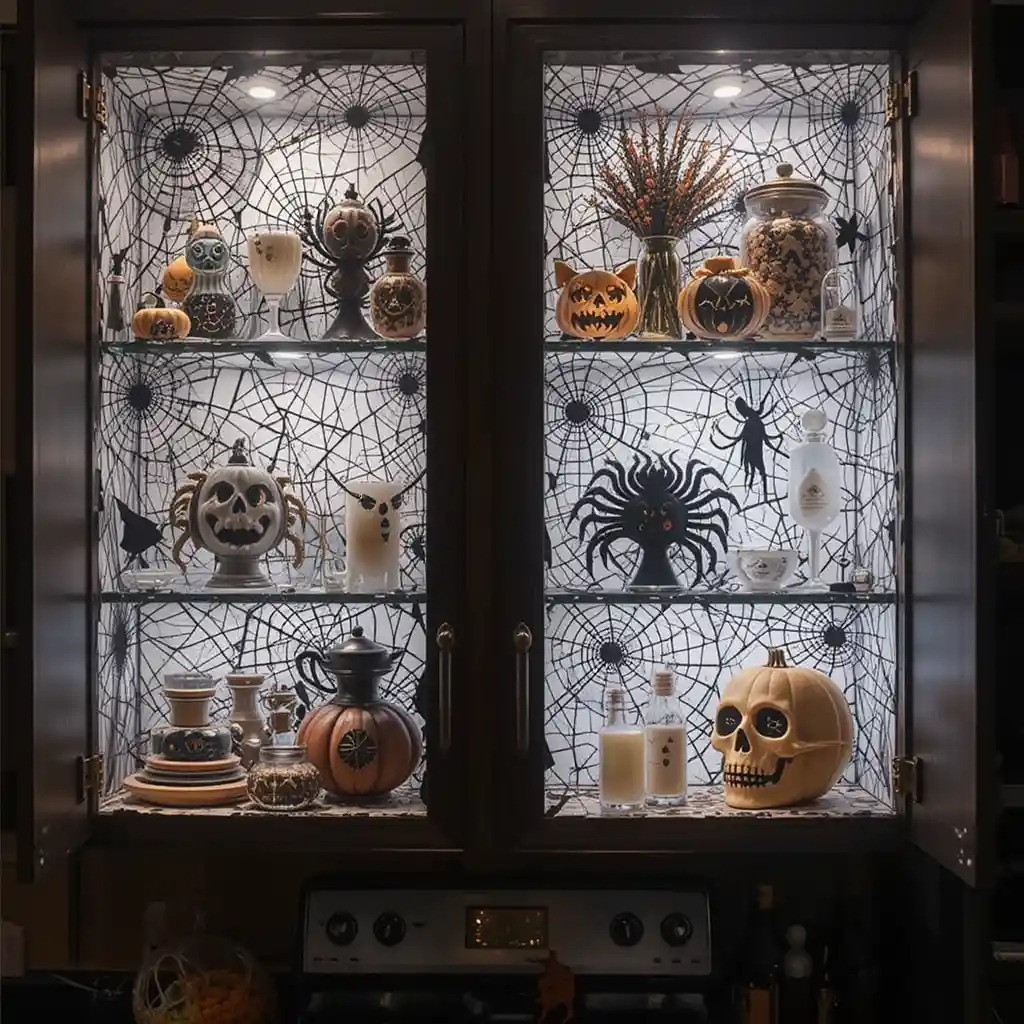 Line your cabinet shelves with black-and-white cobweb patterned paper. This adds Halloween style without permanent changes.