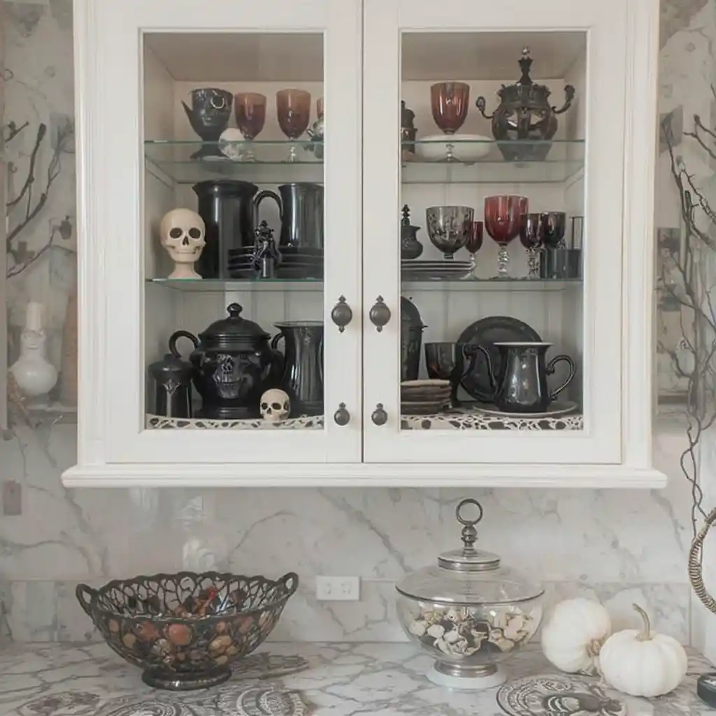 Showcase black dishware, skull cups, and deep red glasses in a glass cabinet for a sophisticated Gothic Halloween look.