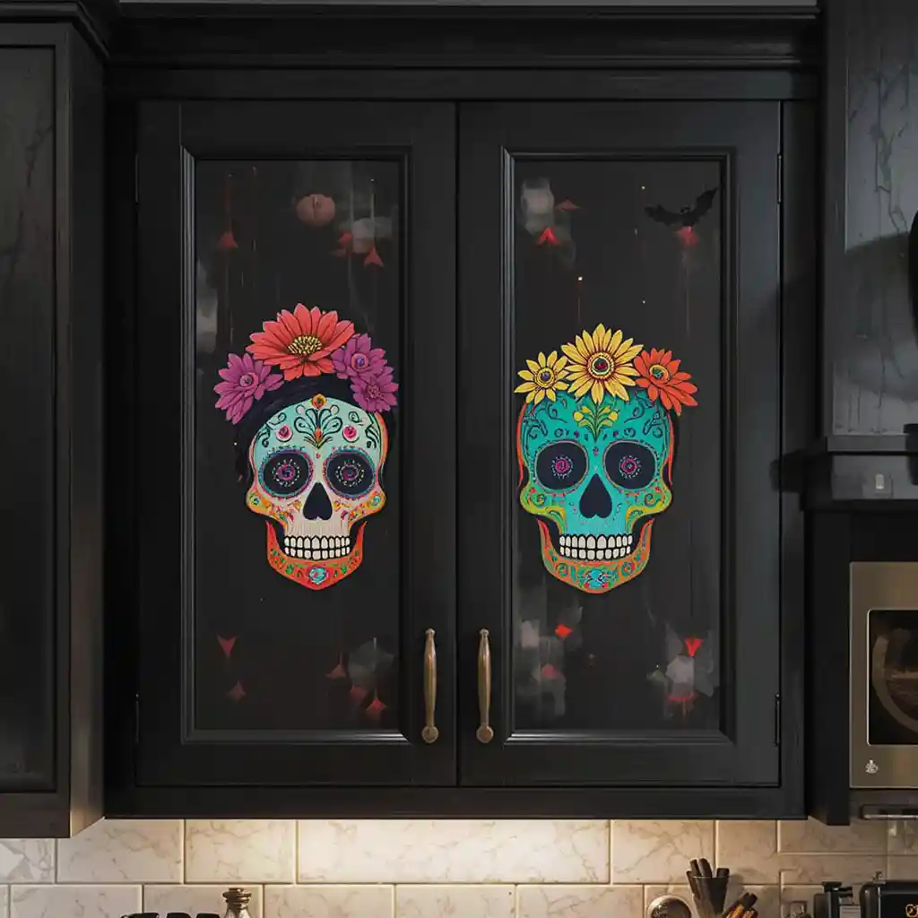 Attach colorful sugar skull decals to cabinet doors for a bold, vibrant Halloween statement that celebrates Día de los Muertos style.