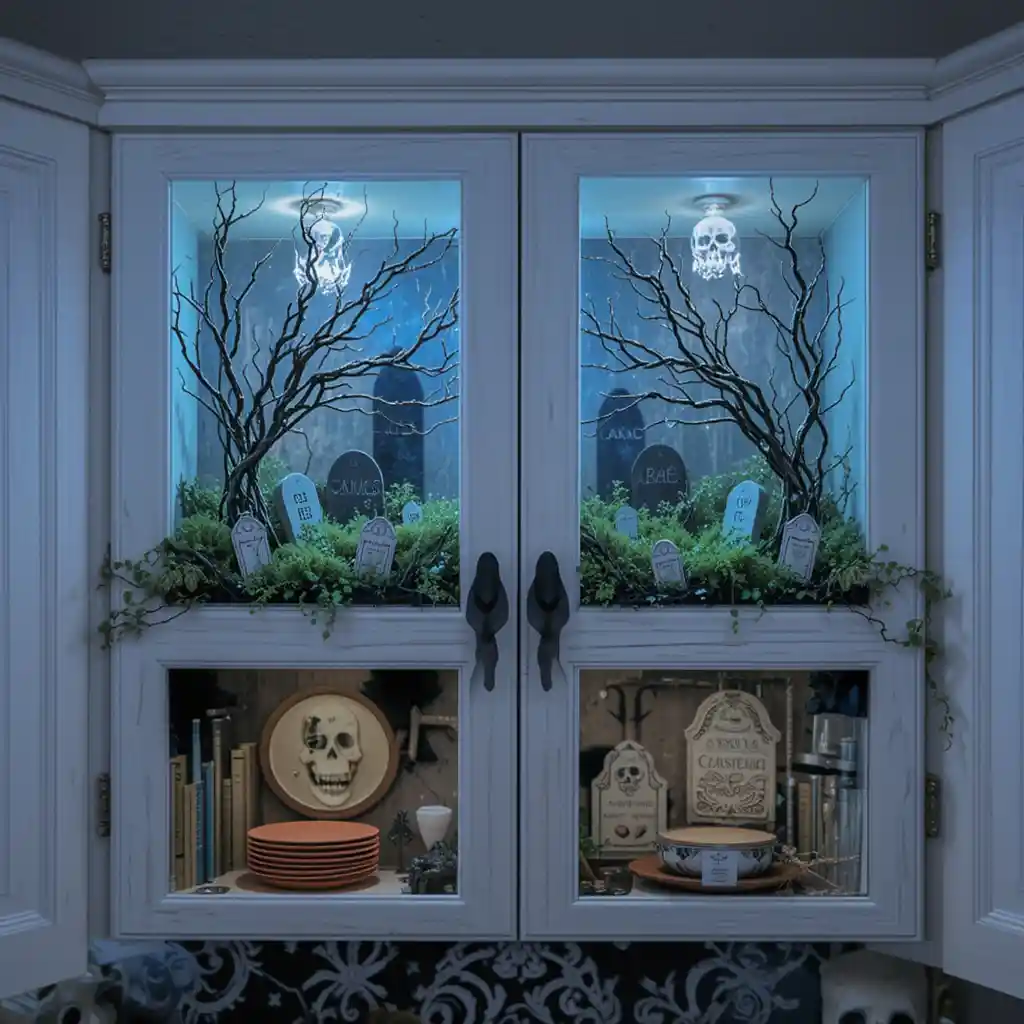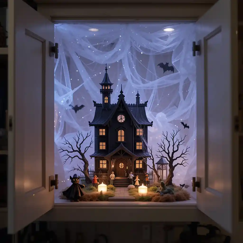 Dedicate one open cabinet shelf to a mini haunted house display. Add tiny figurines, cobwebs, and LED tea lights for a magical nighttime effect.