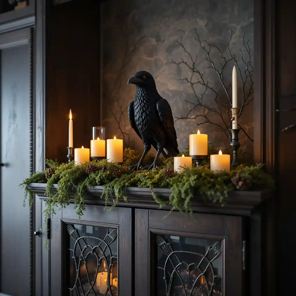 Place a black raven figurine on top of your cabinet, surrounded by fake moss and flickering candles for a dramatic, mysterious atmosphere.