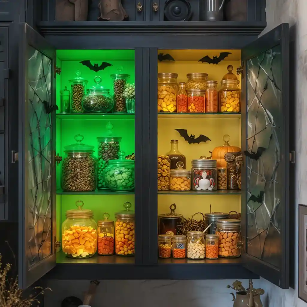 Fill one cabinet with Halloween-themed snacks like candy corn jars, bat-shaped cookies, and pumpkin spice treats for a festive surprise.