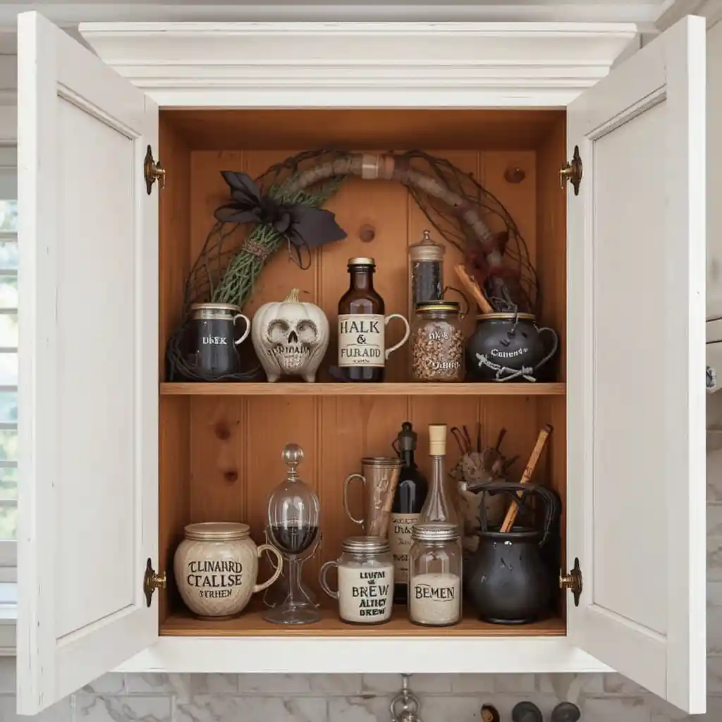 Transform your coffee cabinet into a witch’s potion bar with cauldron mugs, cinnamon sticks, and labeled “brew” jars.