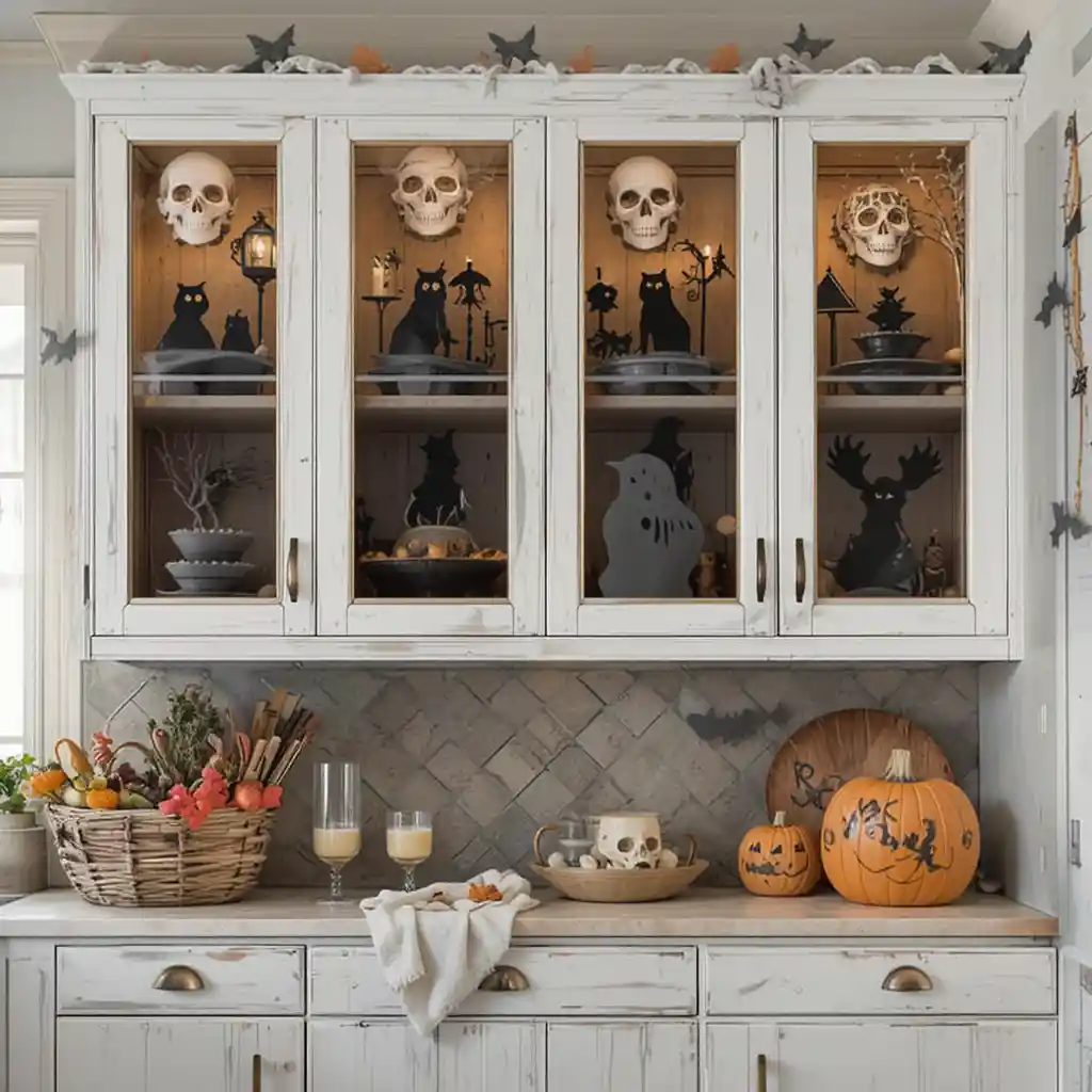 Halloween Cabinet Decor Ideas doesn’t stop at pumpkins on your porch—it can extend right into your kitchen cabinets. From spooky lighting to themed displays, your cabinets can become the highlight of your Halloween home. Whether you’re going for eerie elegance or playful fright, these 22 unique Halloween cabinet decor ideas will inspire you to turn your kitchen into a haunted masterpiece.