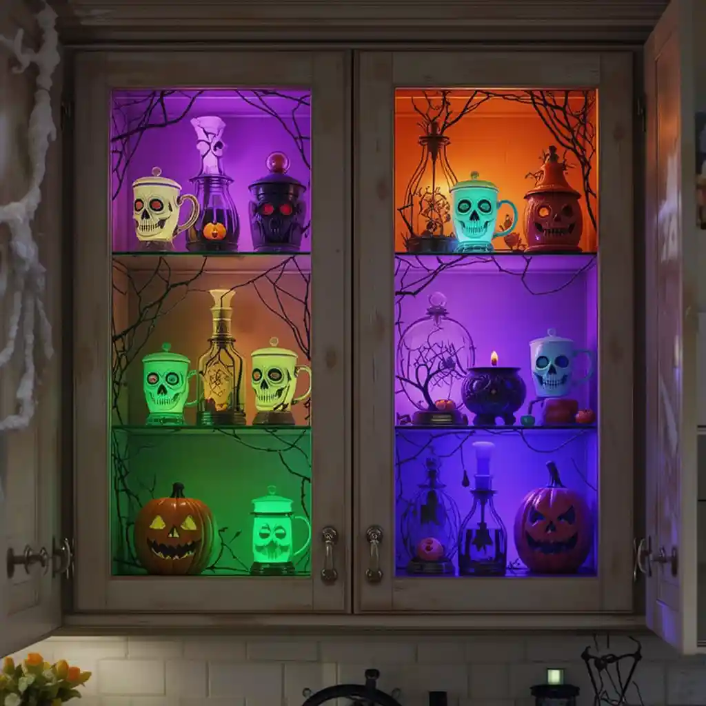 Place orange, purple, or green LED lights inside glass-front cabinets. Display Halloween mugs, skulls, and mini pumpkins to create a glowing spooky showcase.