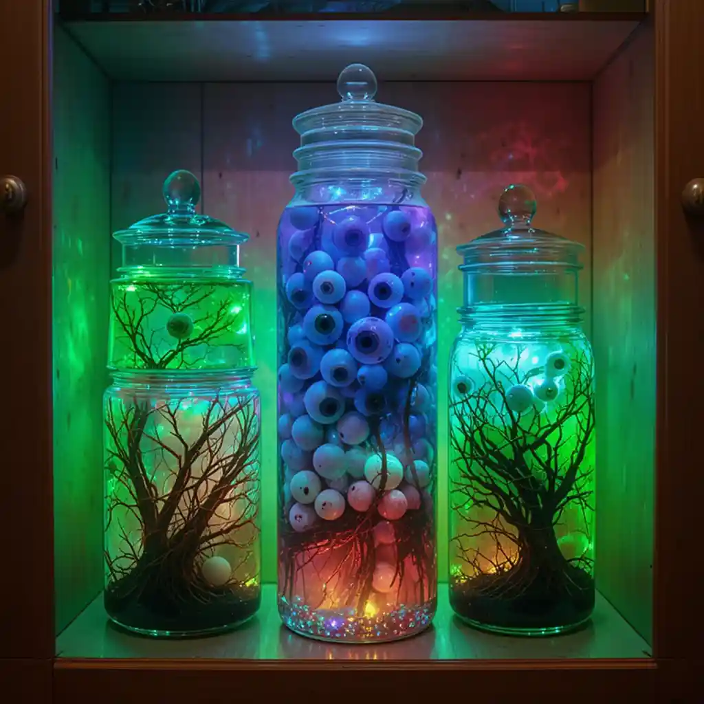 Display jars filled with faux eyeballs, floating in colored water, inside a cabinet with green backlighting for maximum creep factor.