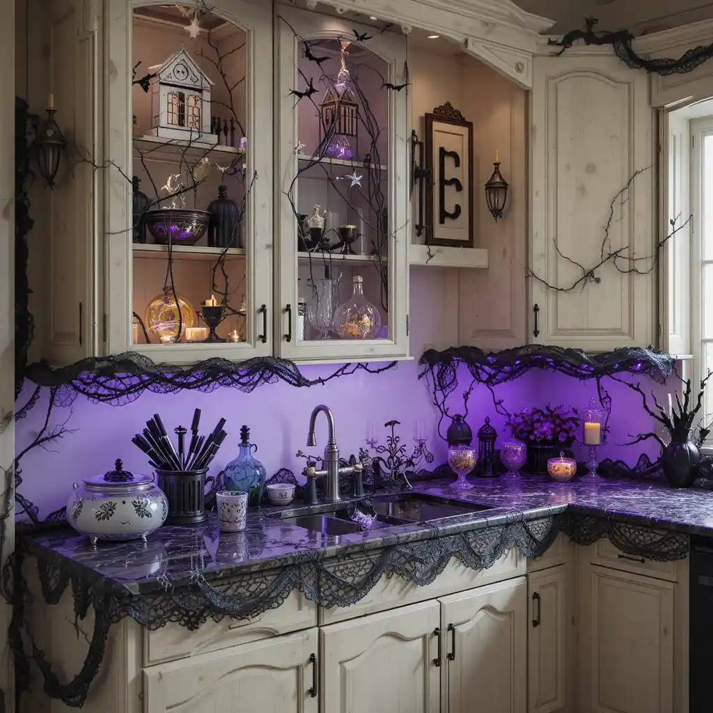Attach black lace or purple velvet trim around cabinet edges for a touch of haunted elegance without major changes.
