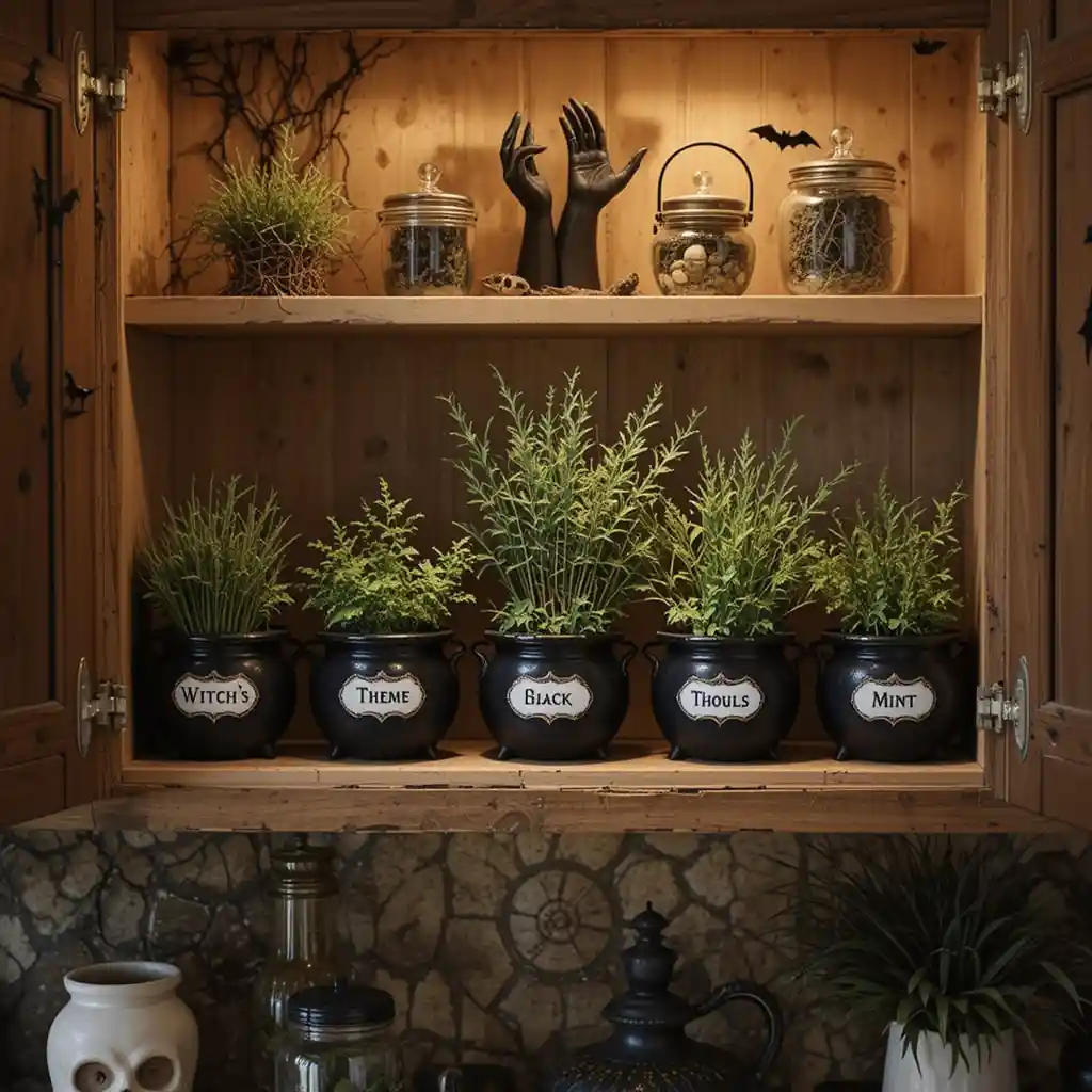 Display small herb jars in black cauldron planters on an open shelf. Label them with spooky names like “Witch’s Thyme” or “Ghoul’s Mint.”