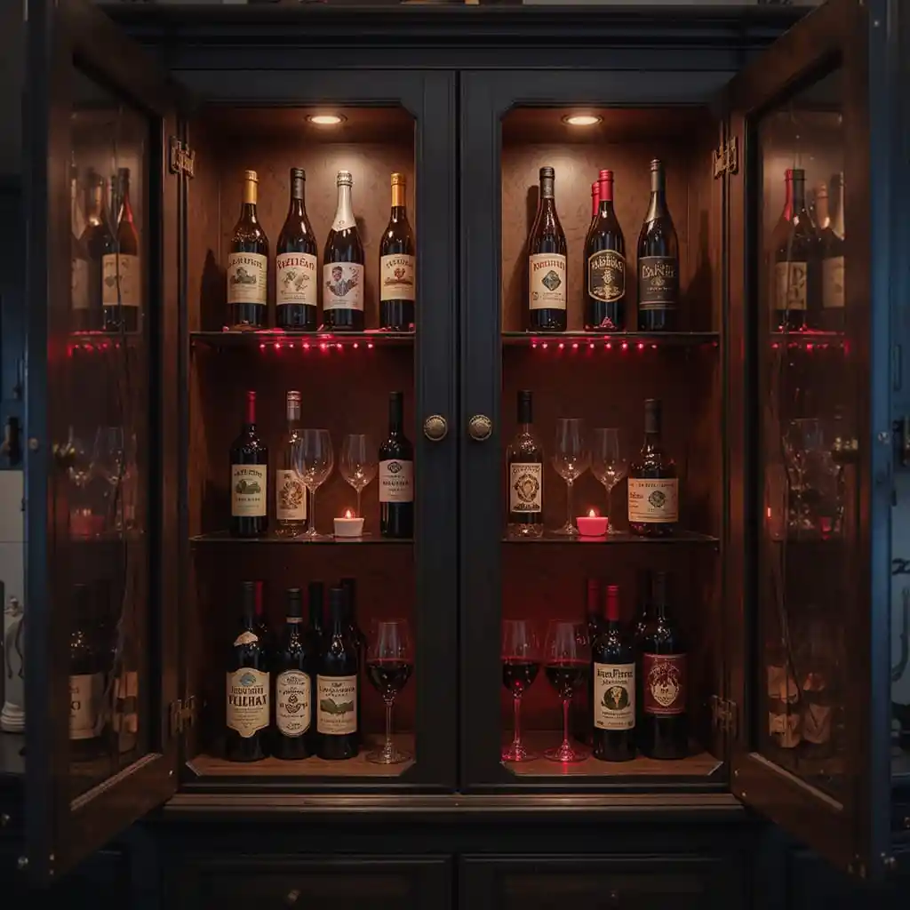 If you have a wine storage cabinet, style it with vampire-themed wine labels, red LED lights, and dark goblets for a luxurious yet spooky look.