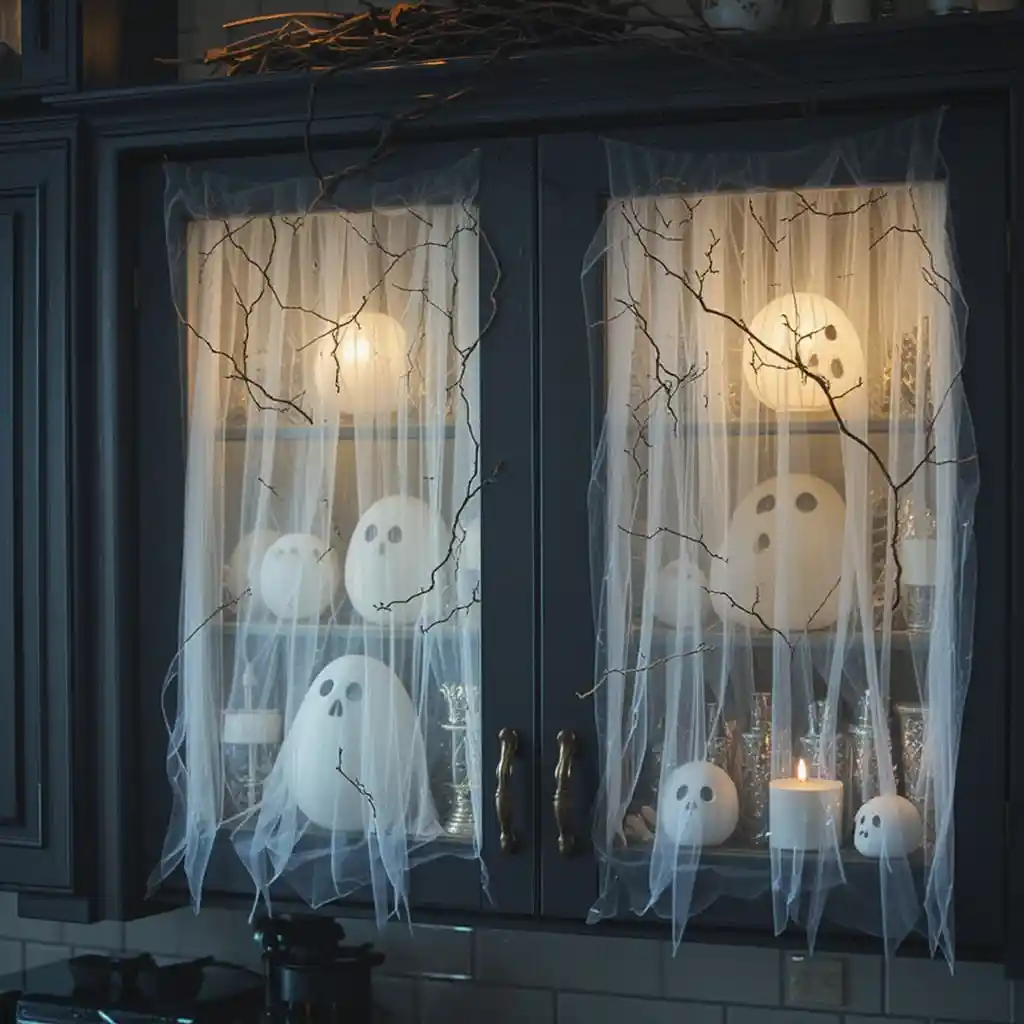 Replace cabinet glass inserts with sheer white fabric to resemble ghostly curtains. Let them drape slightly for a whimsical, eerie feel.