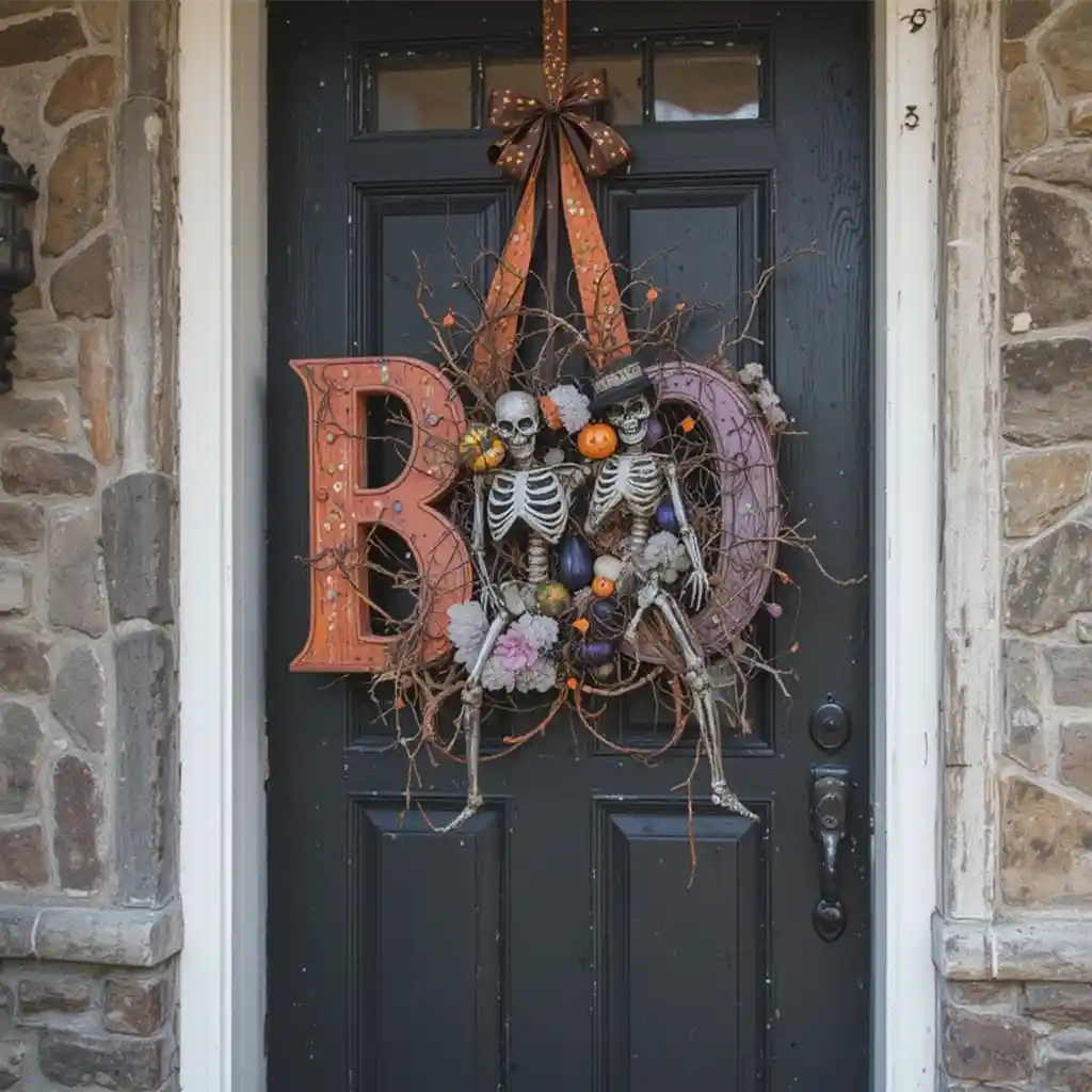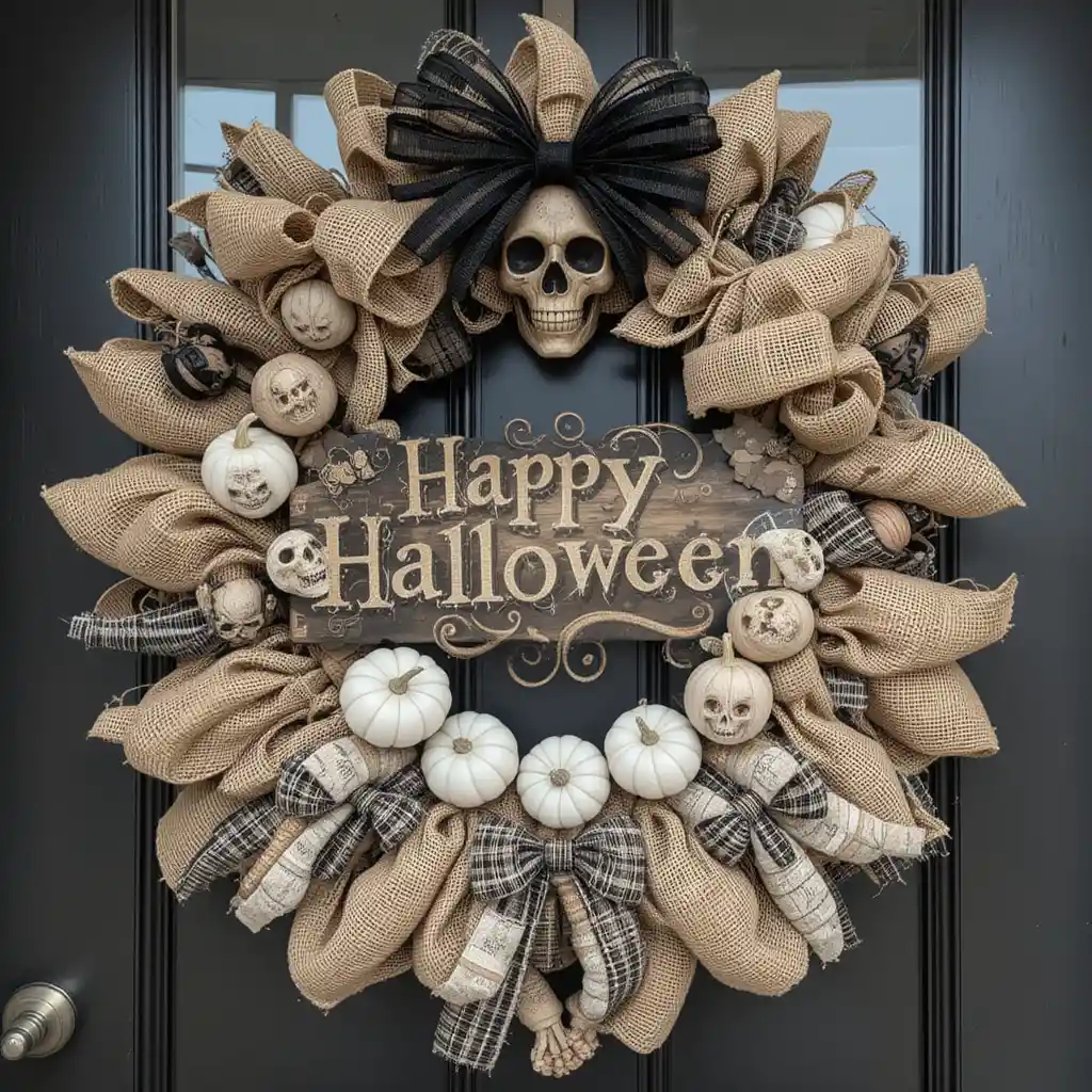 Go for a farmhouse Halloween door hanger made of burlap, wood, and muted tones. Pair it with white pumpkins or neutral plaid bows for a cozy seasonal vibe.