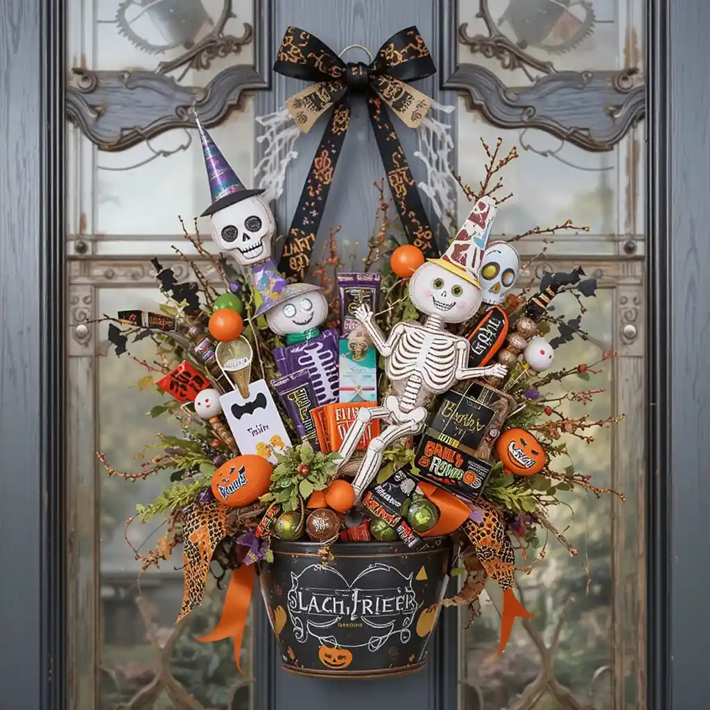 Create a trick-or-treat bucket hanger filled with faux candy, ribbons, and Halloween cutouts. It doubles as décor and a festive candy station.