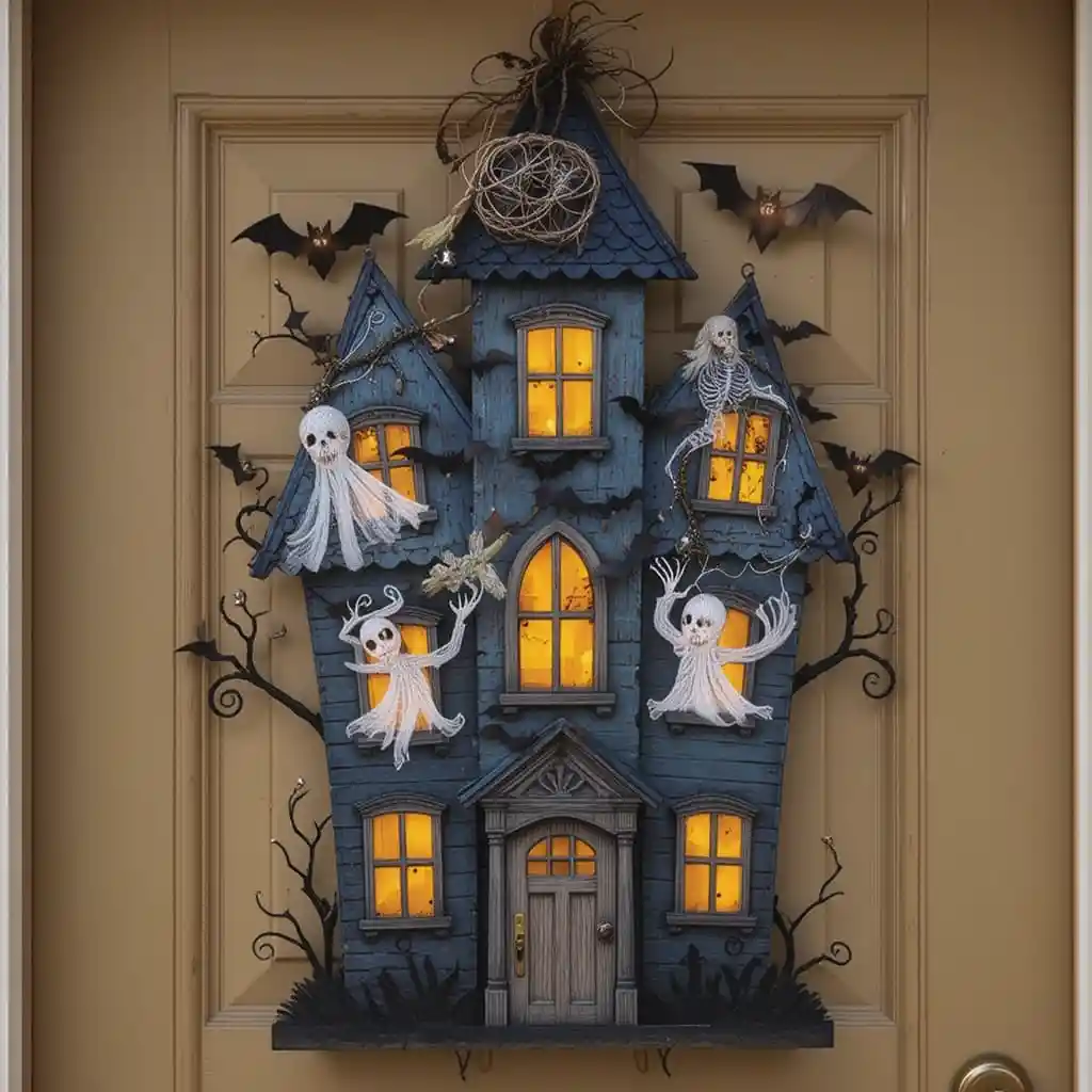 Choose a haunted house door hanger made from wood or foam board. Paint it with bats, ghosts, and glowing windows for a spooky entrance. Halloween Door Hangers