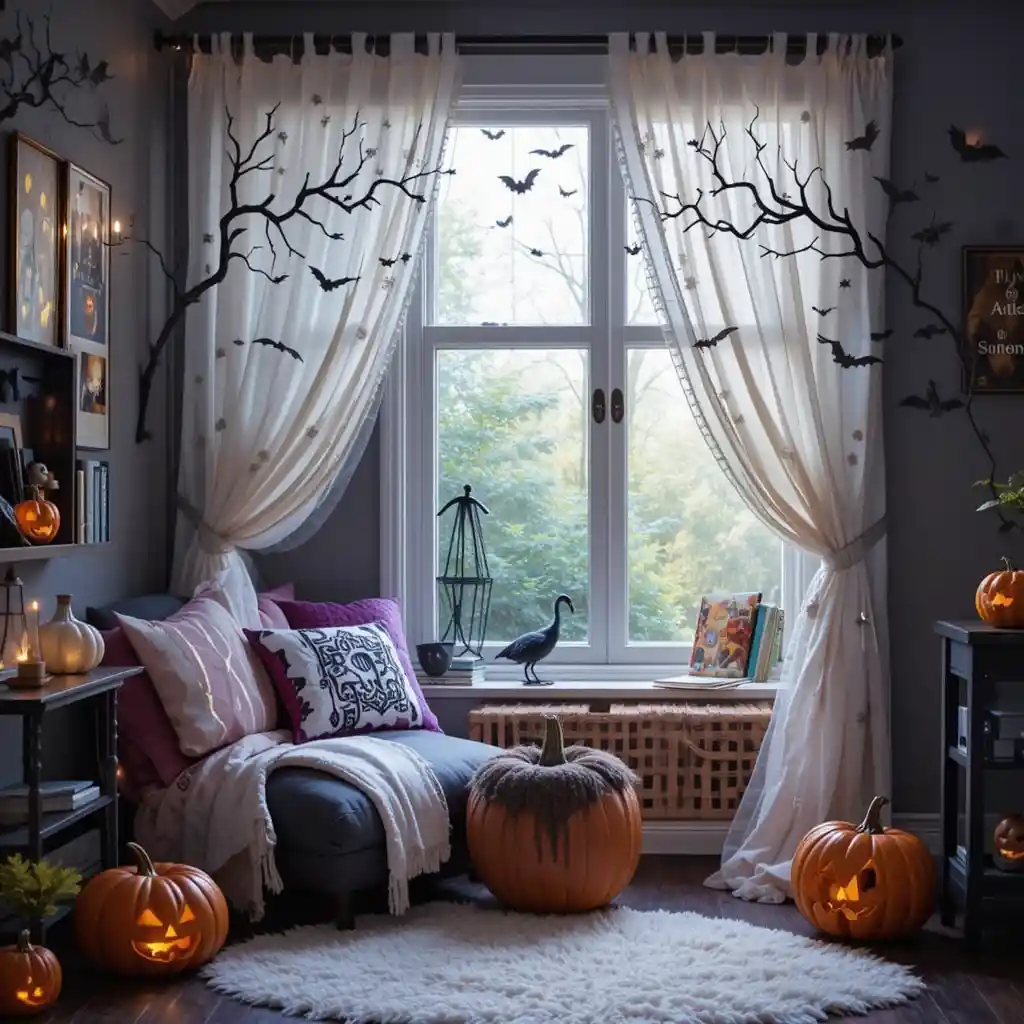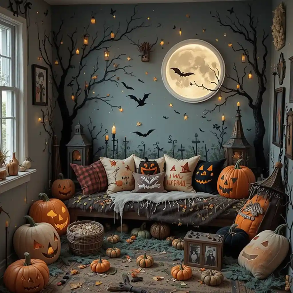 Hang artificial fall leaves from a canopy above the nook for a woodland-inspired Halloween vibe.