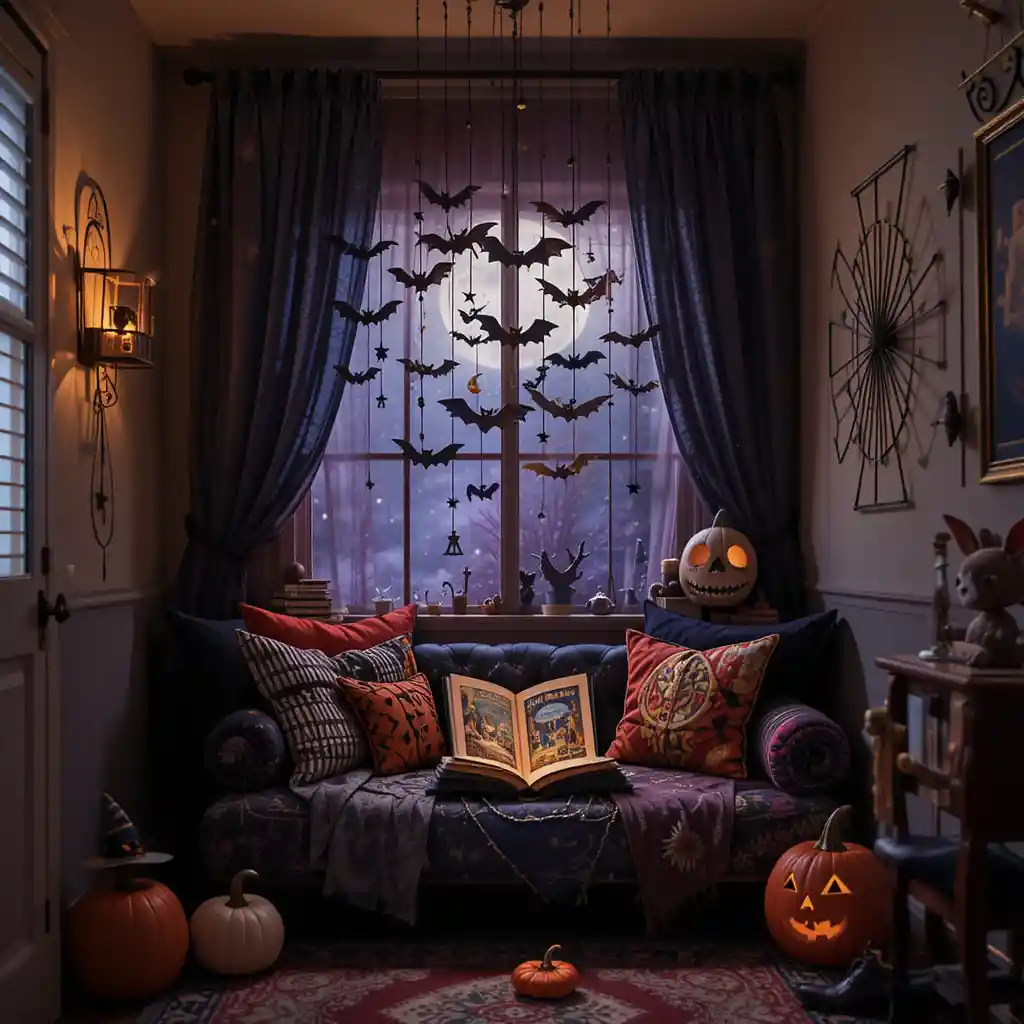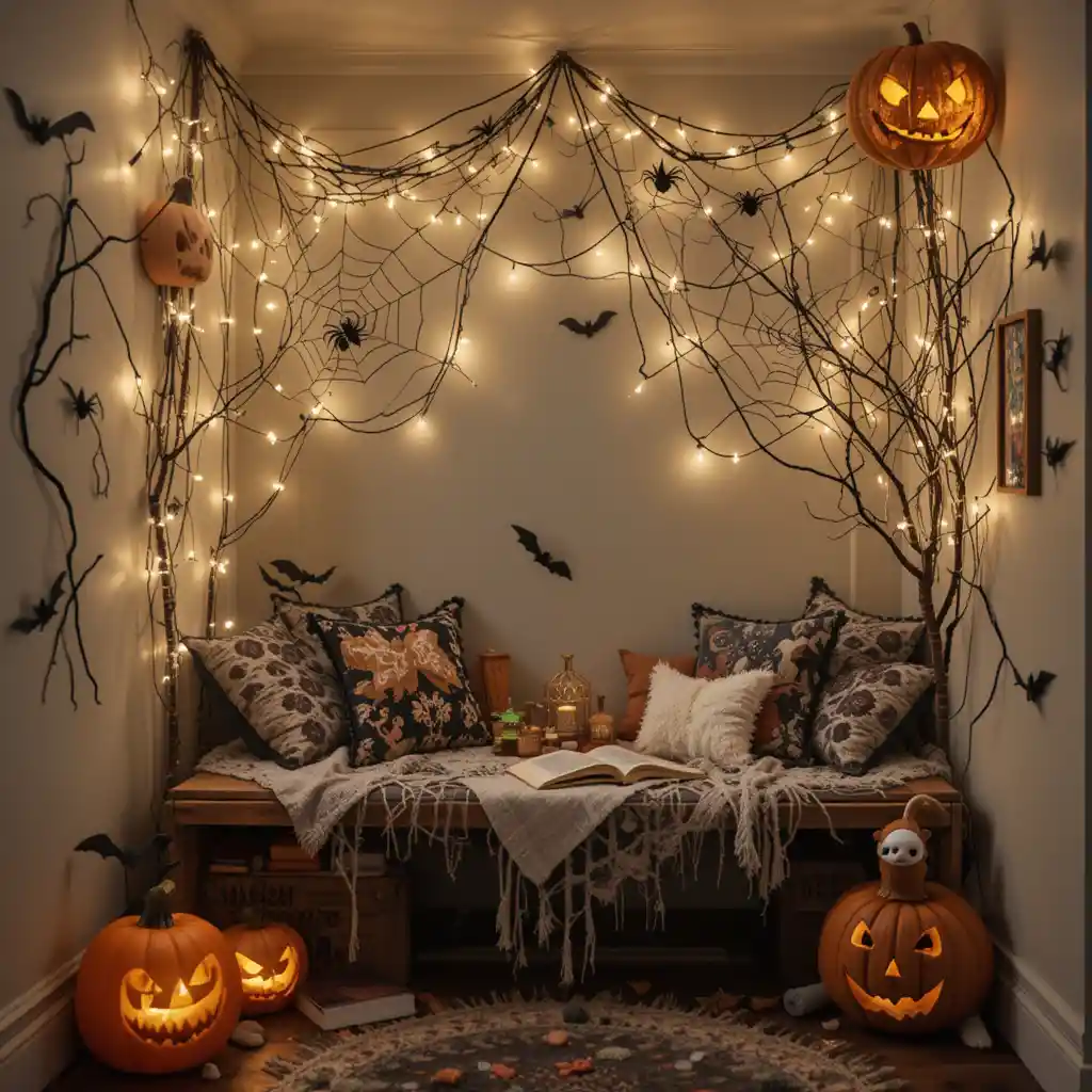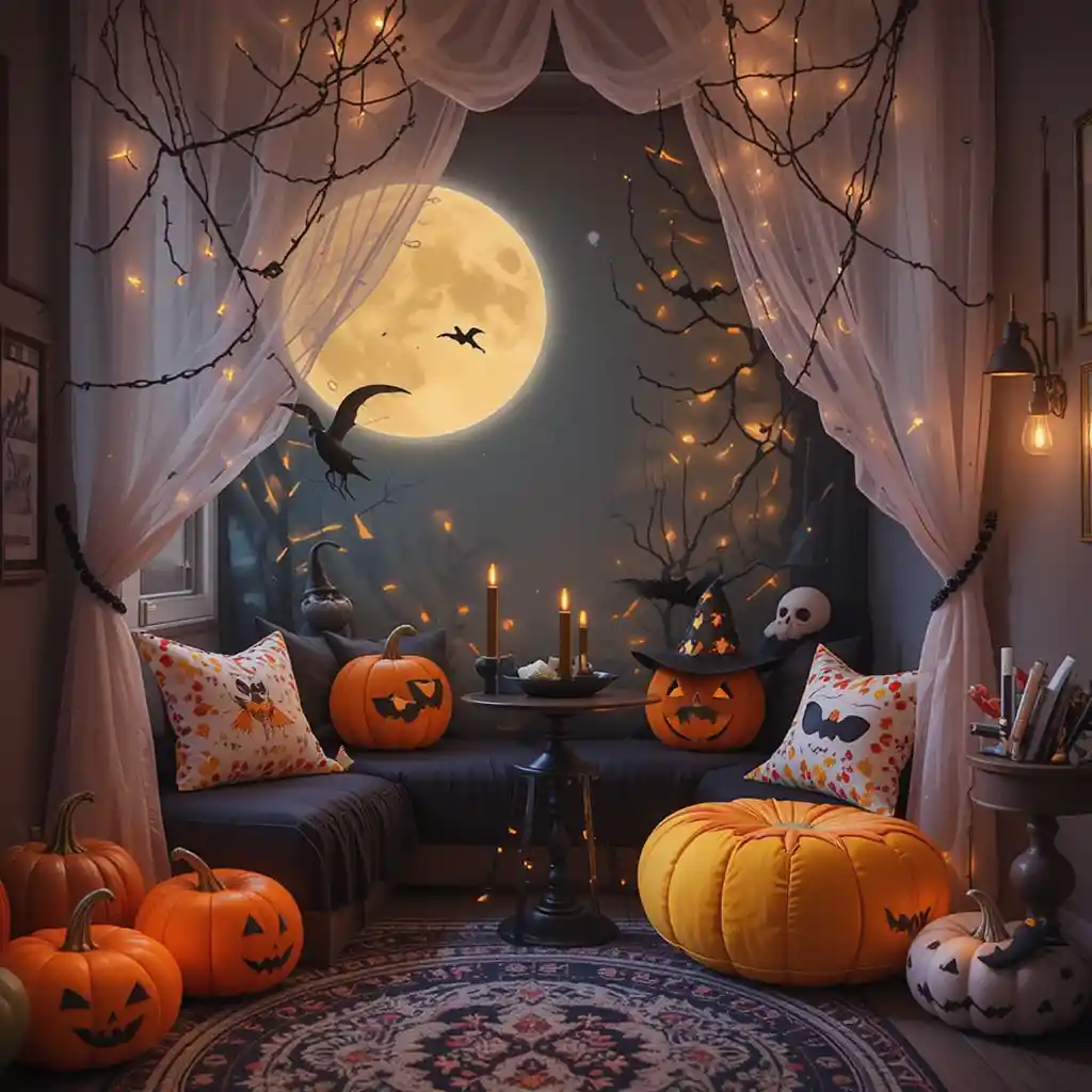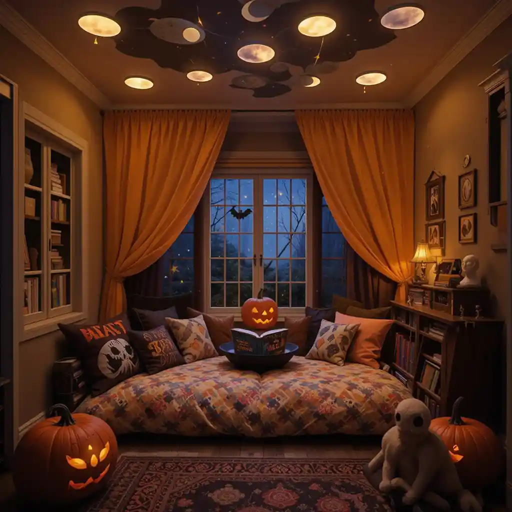 Turn the nook into a mini fort with black and orange blankets, adding string lights inside for a magical hideaway. Halloween Kids Reading Nook Ideas