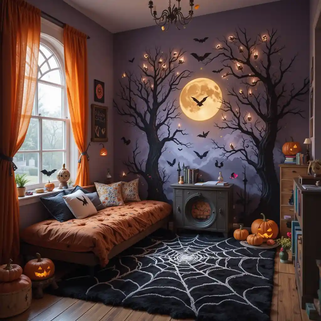 Place a spider web-patterned rug on the floor to make the space both seasonal and comfy.