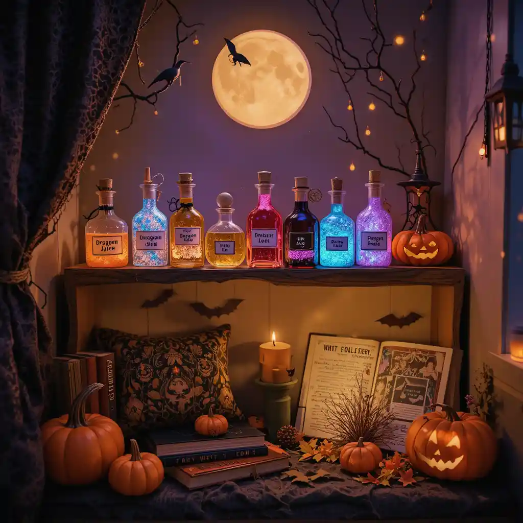 Decorate a shelf with kid-friendly potion bottles filled with glitter water and labeled with fun names like “Dragon Juice” or “Fairy Mist.”