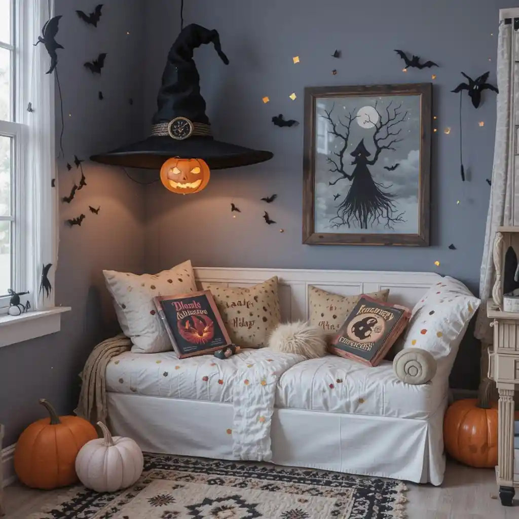 Replace a regular lamp shade with a decorative witch hat to give your reading nook a whimsical and festive twist.