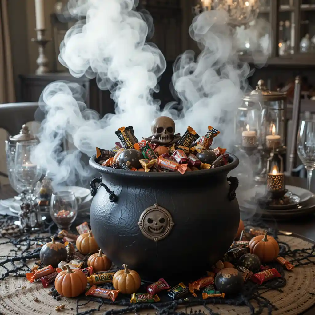 Use a black cauldron filled with wrapped Halloween candy, adding dry ice on party nights for a smoky, magical effect.