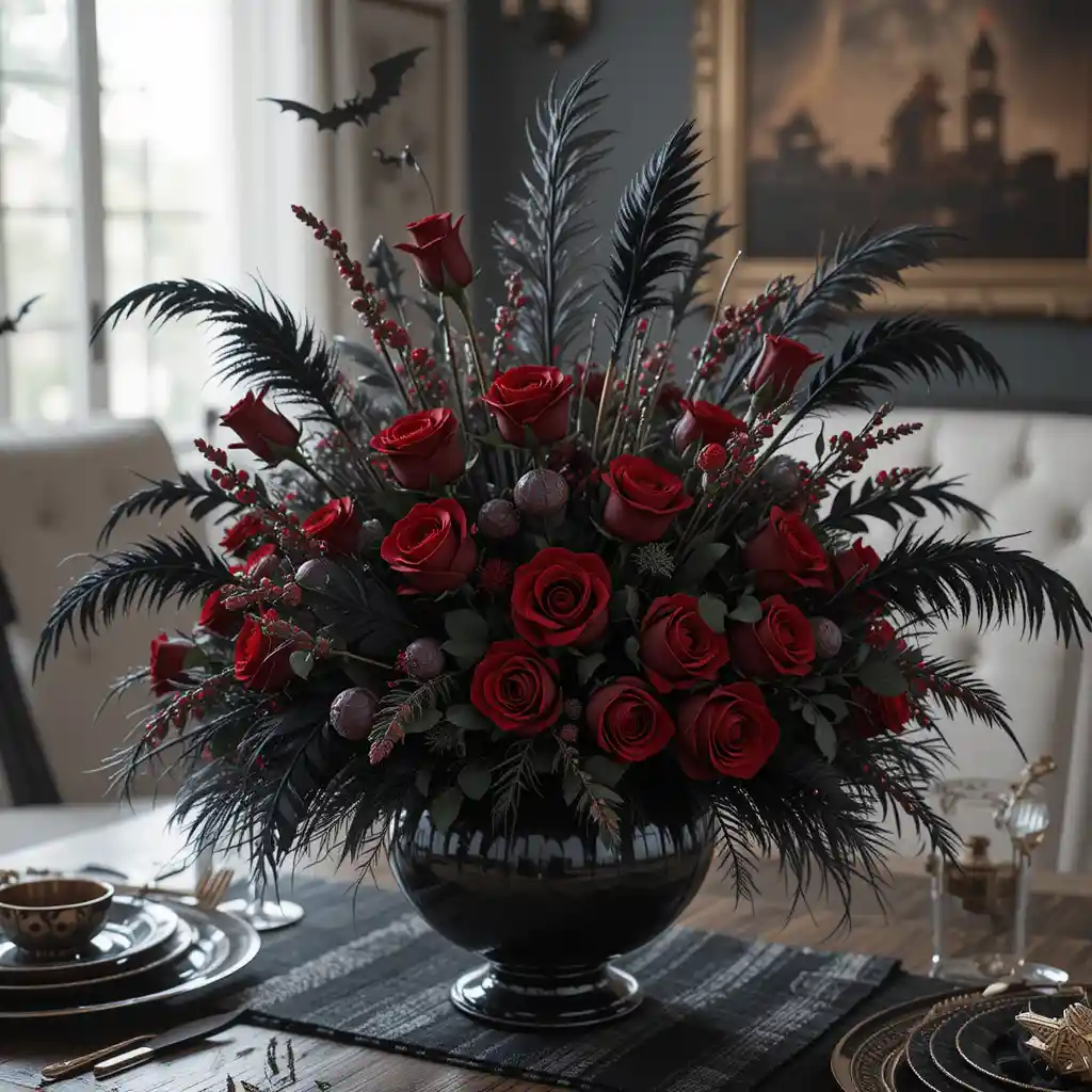 Combine deep red roses, black feathers, and dark greenery in a vase for a dramatic Halloween floral centerpiece.