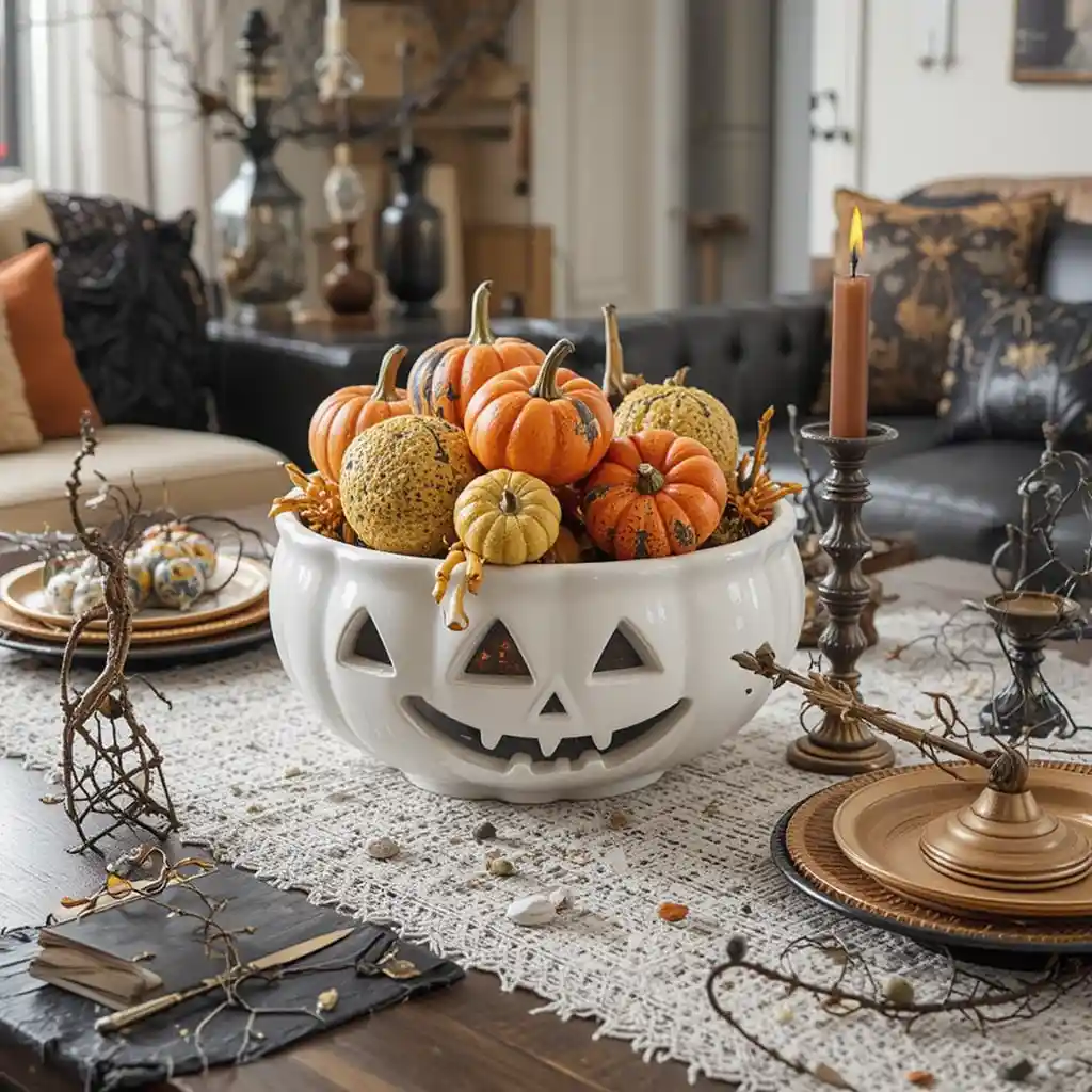 Use a ceramic jack-o’-lantern bowl to serve snacks or display faux gourds for a cheerful yet festive vibe.