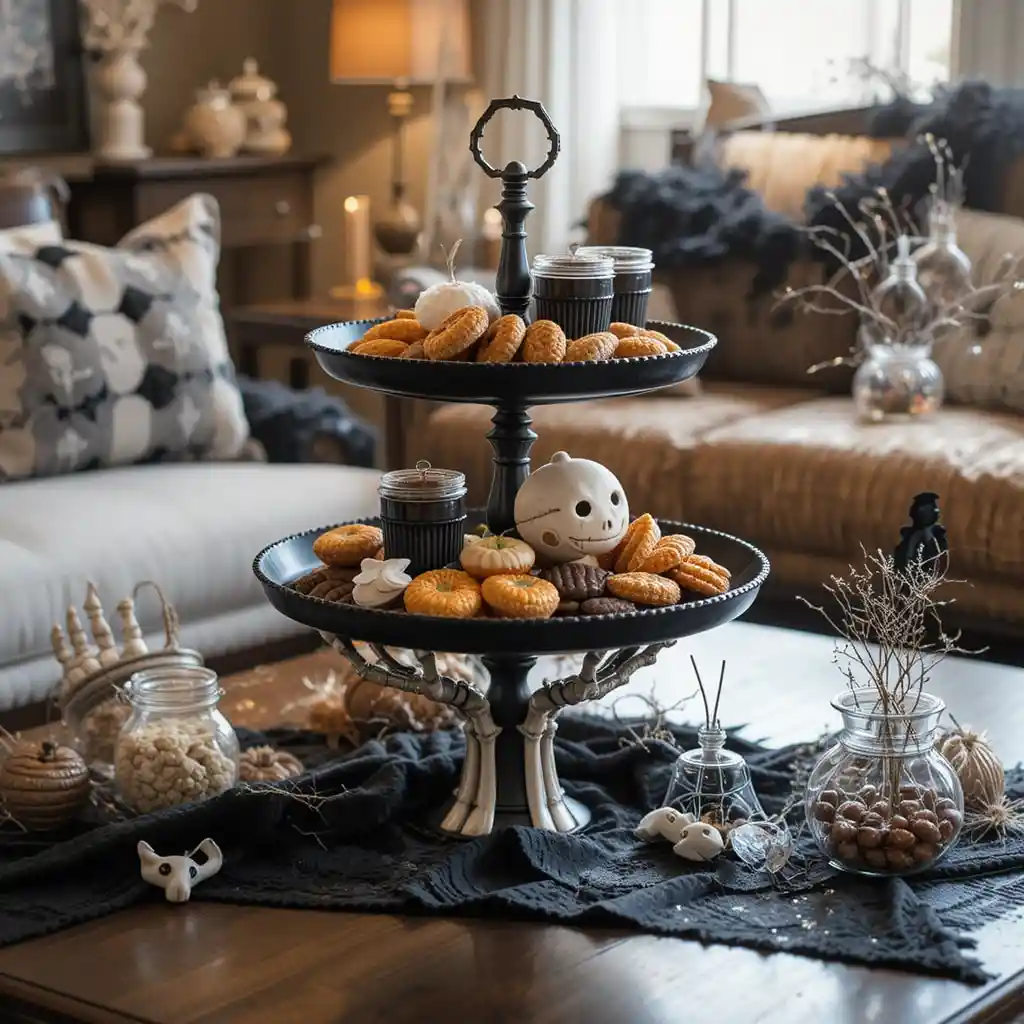 Serve treats on a tiered tray supported by a decorative skeleton hand for a spooky yet functional decor piece.
