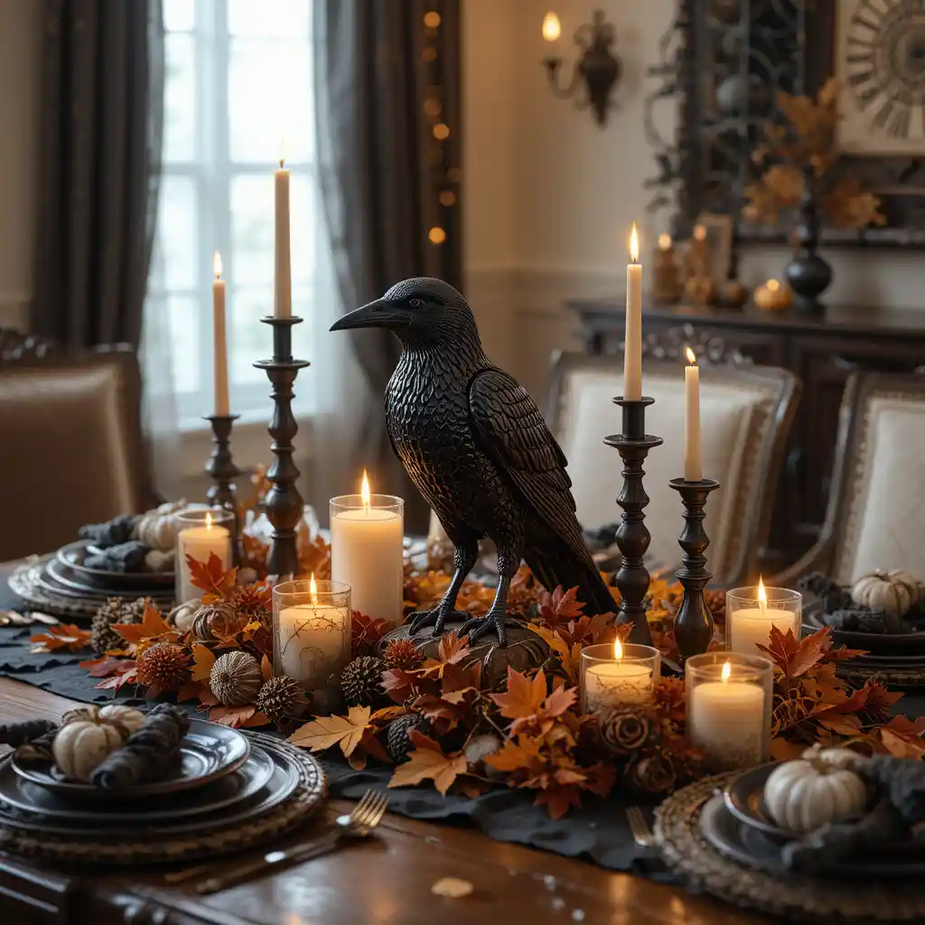 Position a realistic black crow figurine among fall leaves and candles for a touch of mystery on your table.