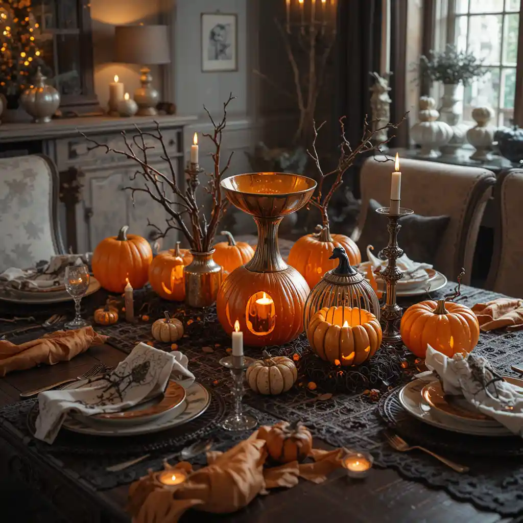 Hollow out small pumpkins to use as candle holders, adding tea lights for a warm, seasonal glow. Halloween Living Room Table Decor Ideas