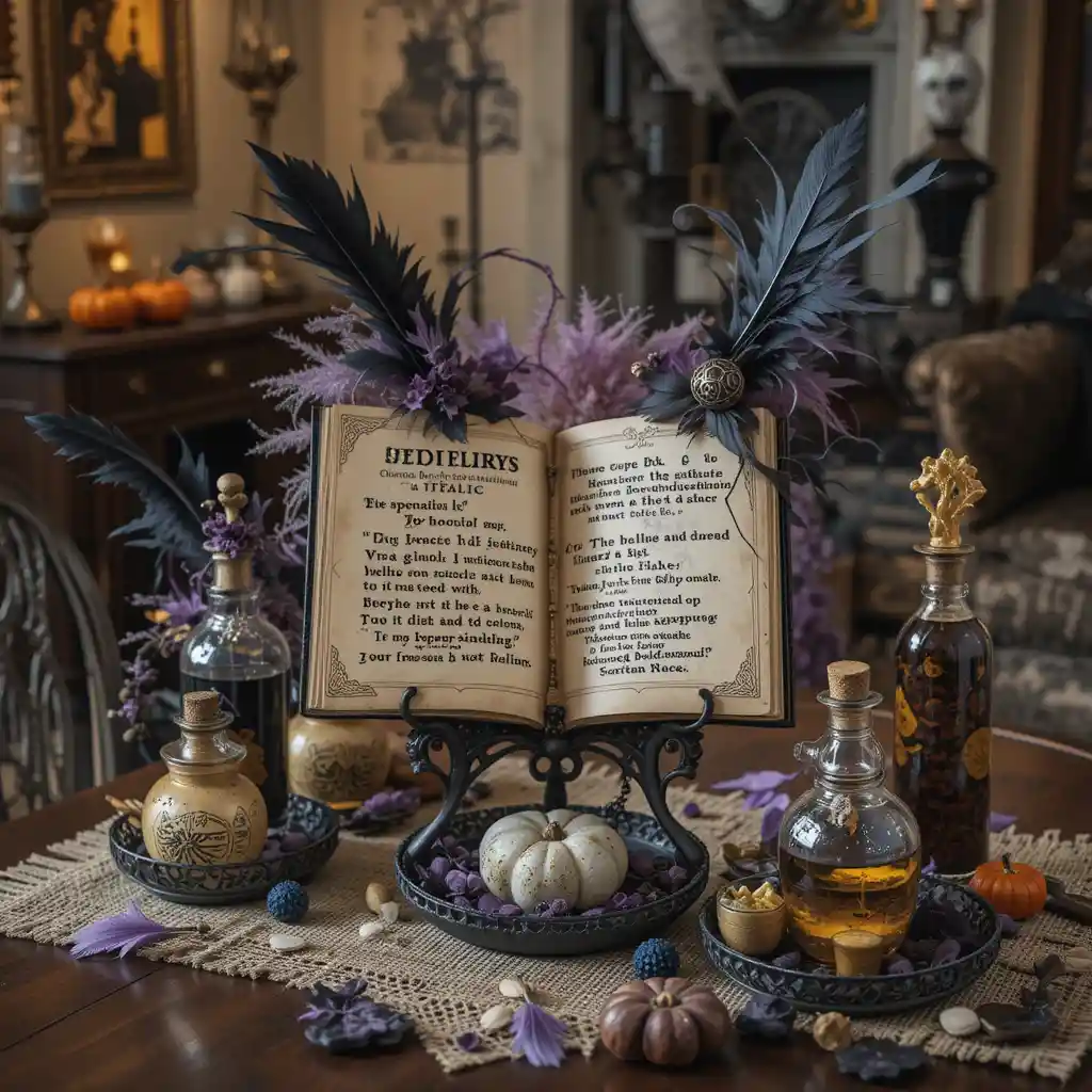 Open a faux spell book on a stand and add props like potion bottles and feathers for an authentic witchy touch. Halloween Living Room Table Decor Ideas