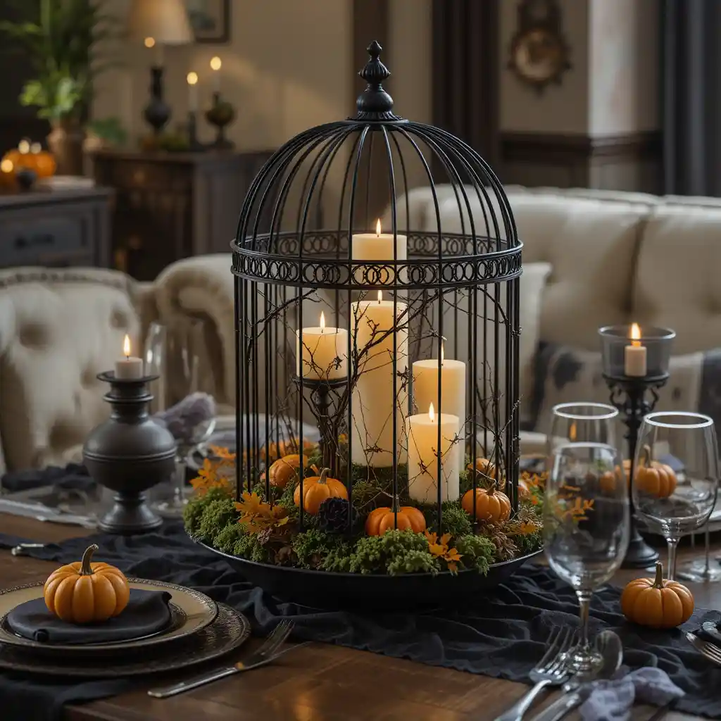 Fill a decorative black birdcage with LED candles, moss, and mini pumpkins for a striking gothic centerpiece.