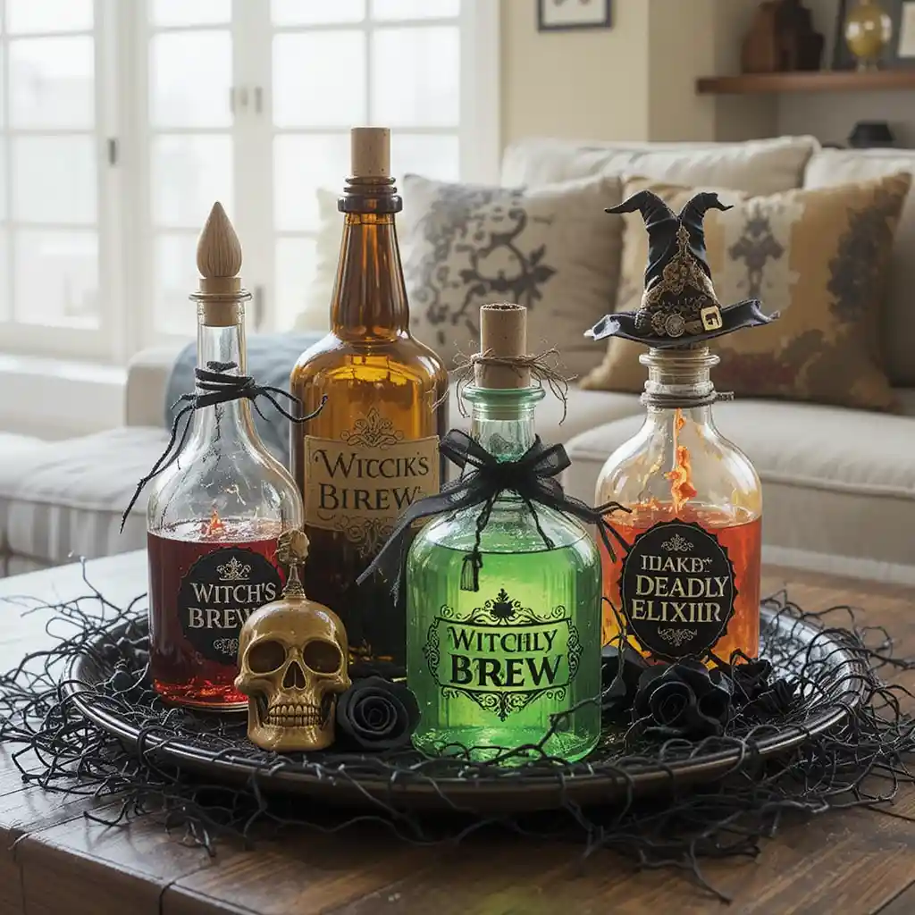 Display glass bottles labeled with spooky names like “Witch’s Brew” or “Deadly Elixir,” filling them with colored water for a realistic touch.