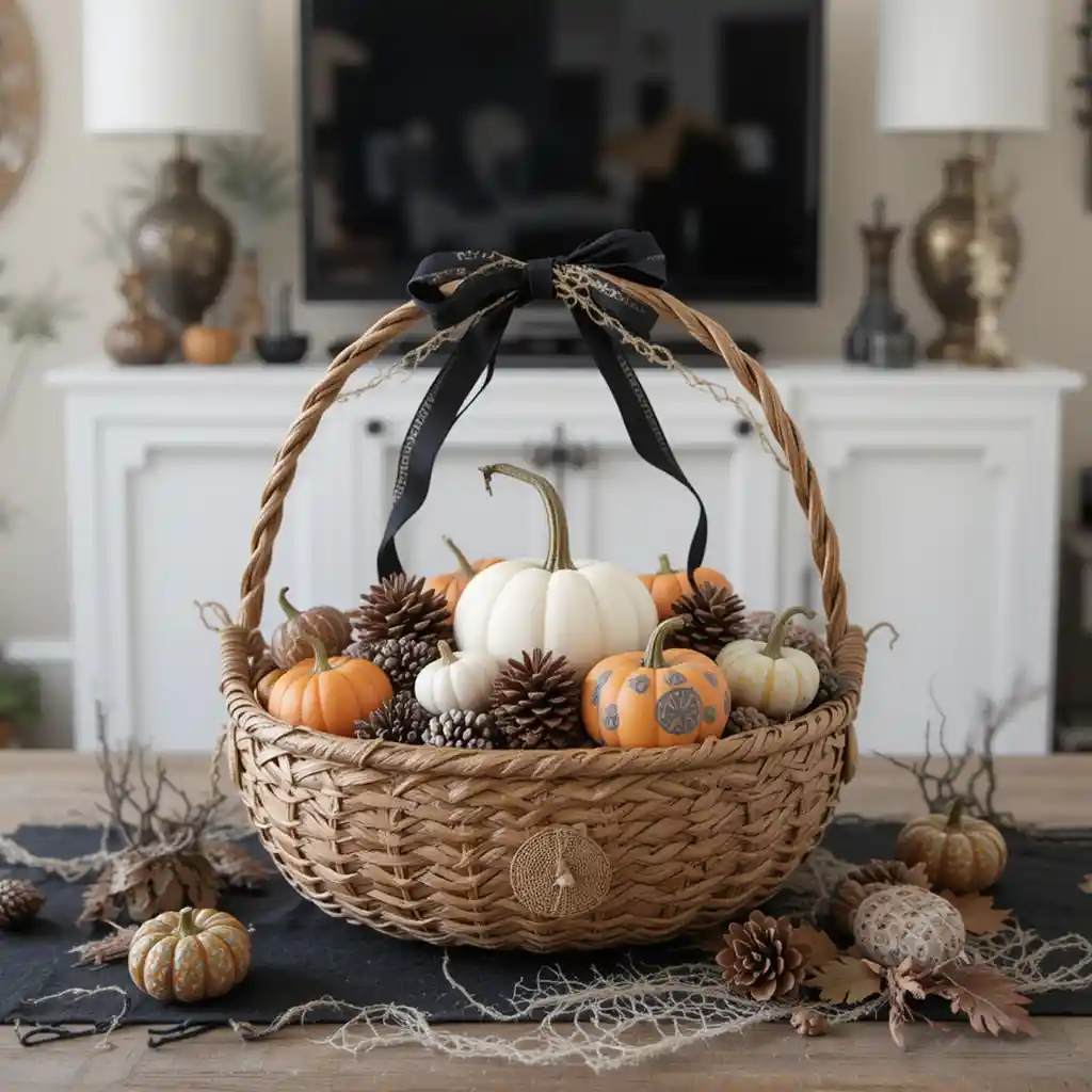 Use a woven basket filled with assorted mini pumpkins, pinecones, and black ribbon for a cozy yet festive look. Halloween Living Room Table Decor Ideas