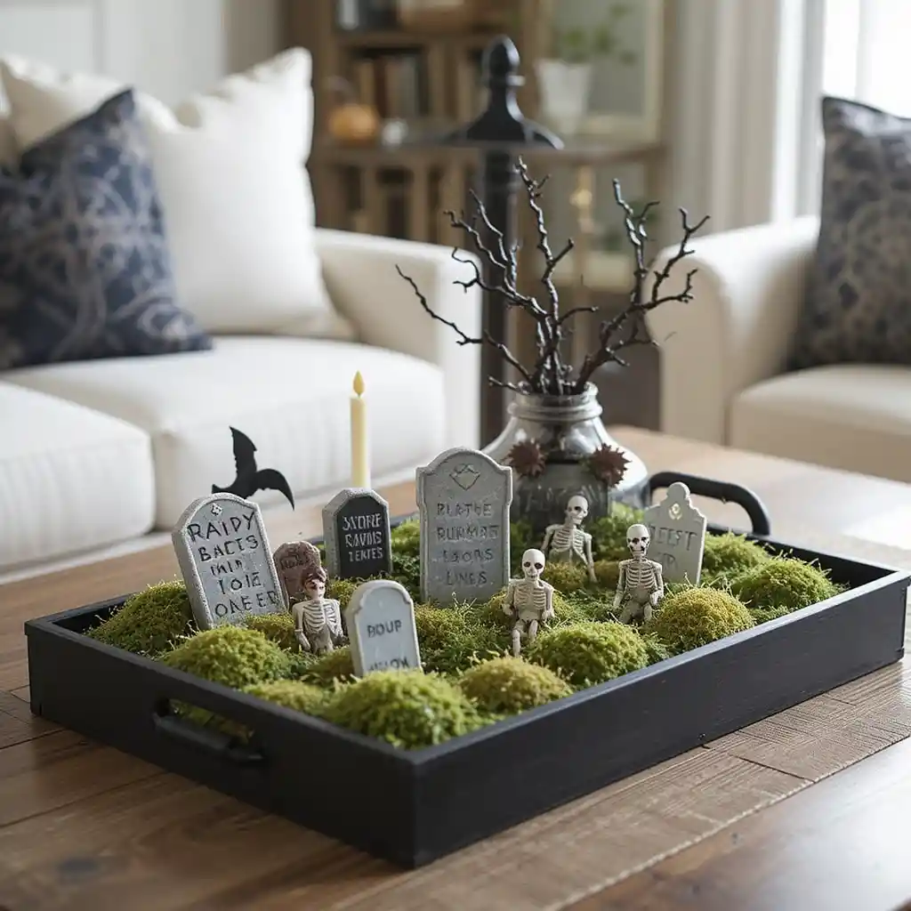 Arrange small tombstones, moss, and skeleton figurines on a black wooden tray to create a chilling graveyard display.