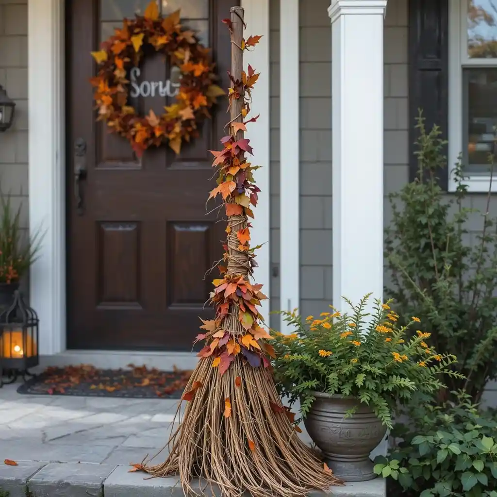 Take a wooden broom and wrap the handle with colorful fall leaves, then lean it against your porch for a witchy, autumnal touch.