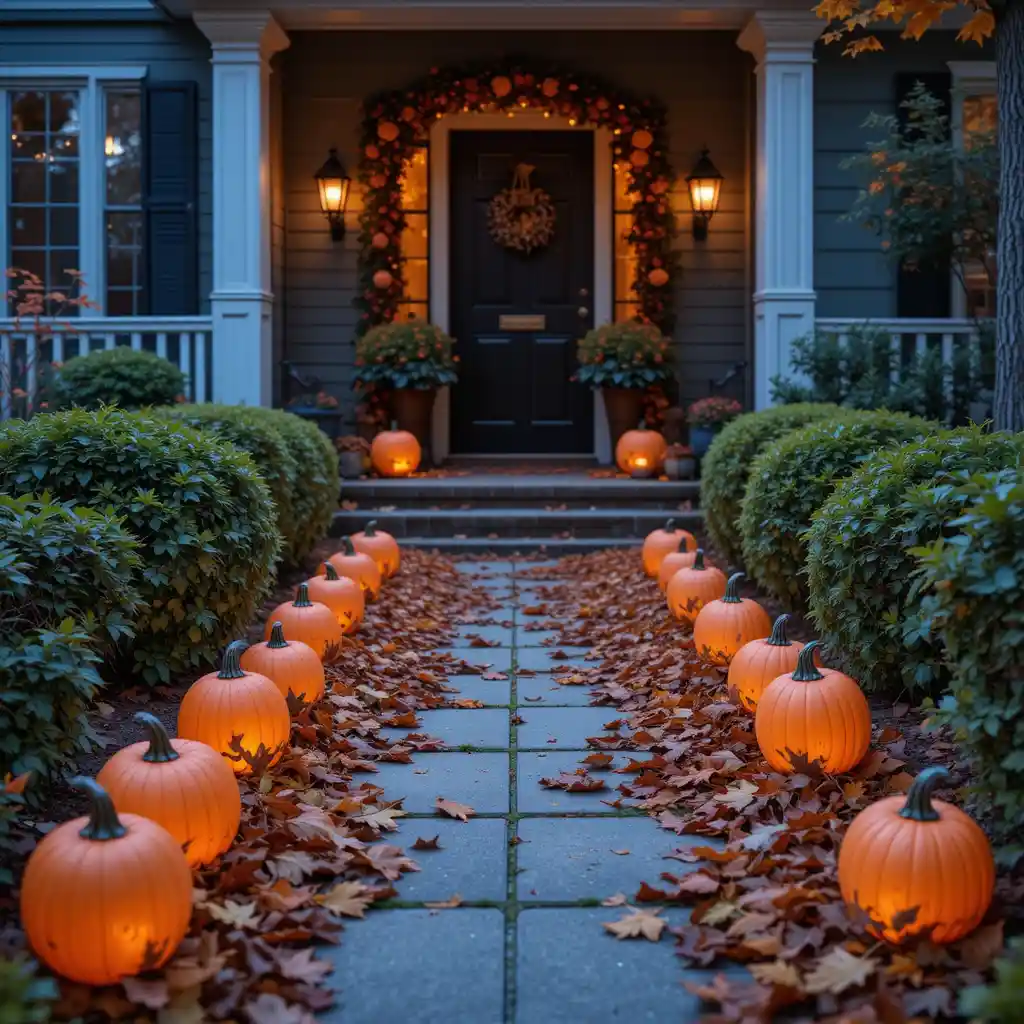 Place lighted pumpkins along a leaf-lined walkway to guide guests to your spooky doorstep.